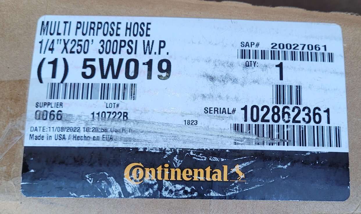 This high-quality air hose from Continental is designed for a variety of uses, including power tools and air compressors. The hose is made from durable nitrile material and measures 1/4" in diameter, with a length of 250'. It has a maximum pressure rating of 250 PSI, making it perfect for heavy-duty applications.