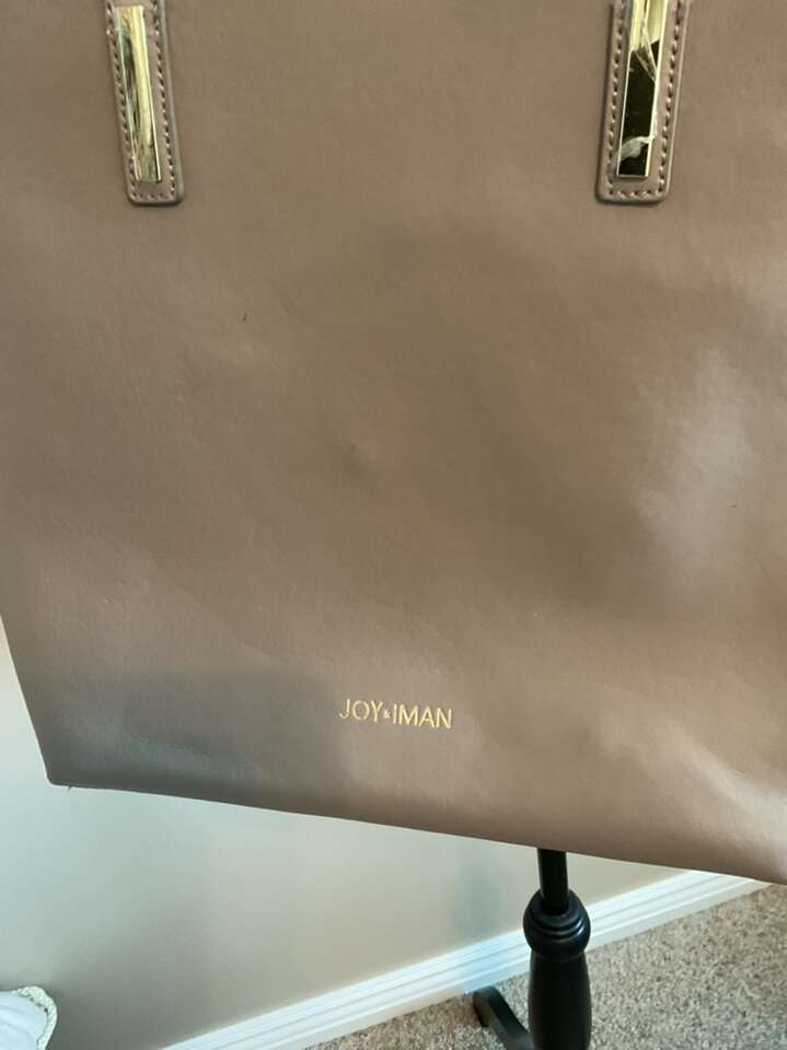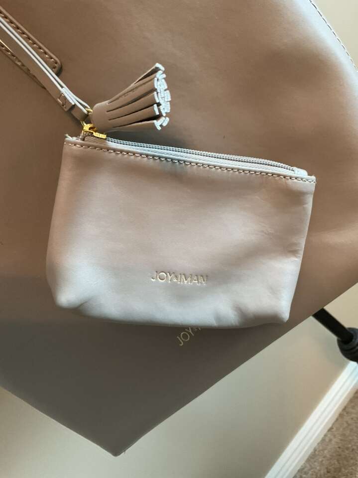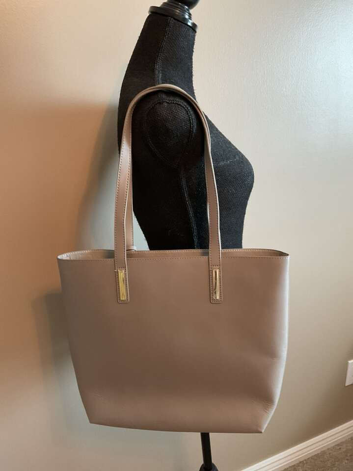 Nice size tote, shoulder bag, purse. It has a removable iPad compartment inside with pockets and zip closure. There is a small wallet- coin bag attached to the shoulder strap. Taupe color with gold accents. The size is 12 inches tall x 15 wide. New