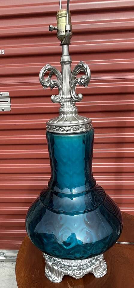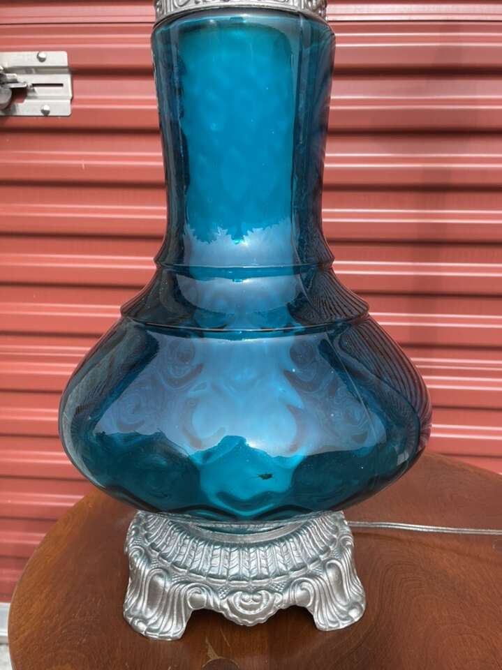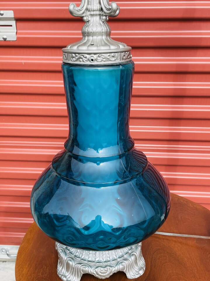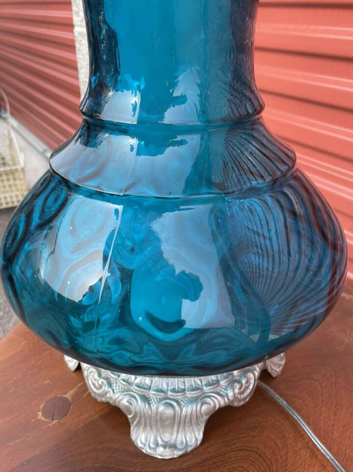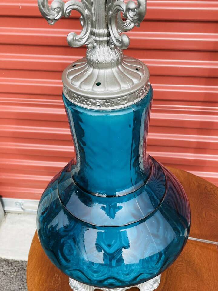 Absolutely stunning blue glass lamp. The glass on this lamp is in perfect condition and is truly beautiful, unfortunately the brass accents have been painted silver but that could be removed possibly.