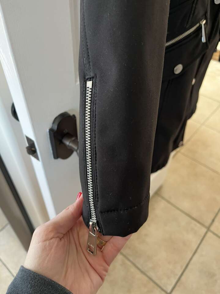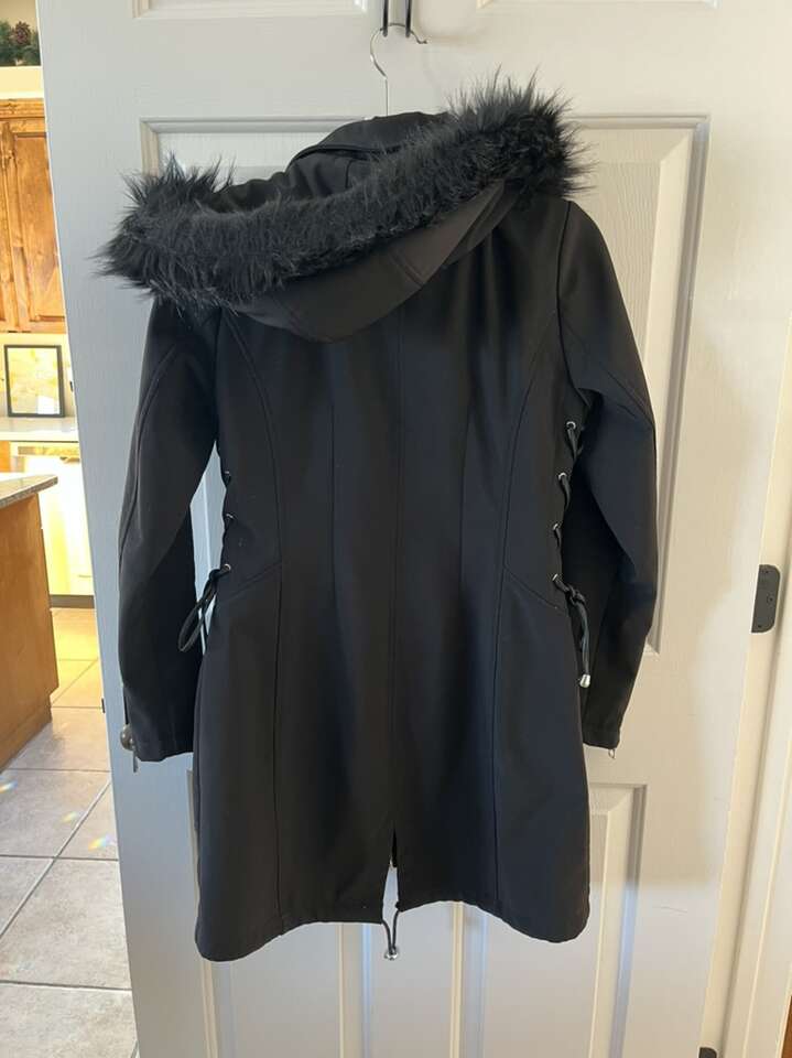 Women’s Black Guess Brand Coat Size Small does have a little bit of white paint and a small hole near the bottom.