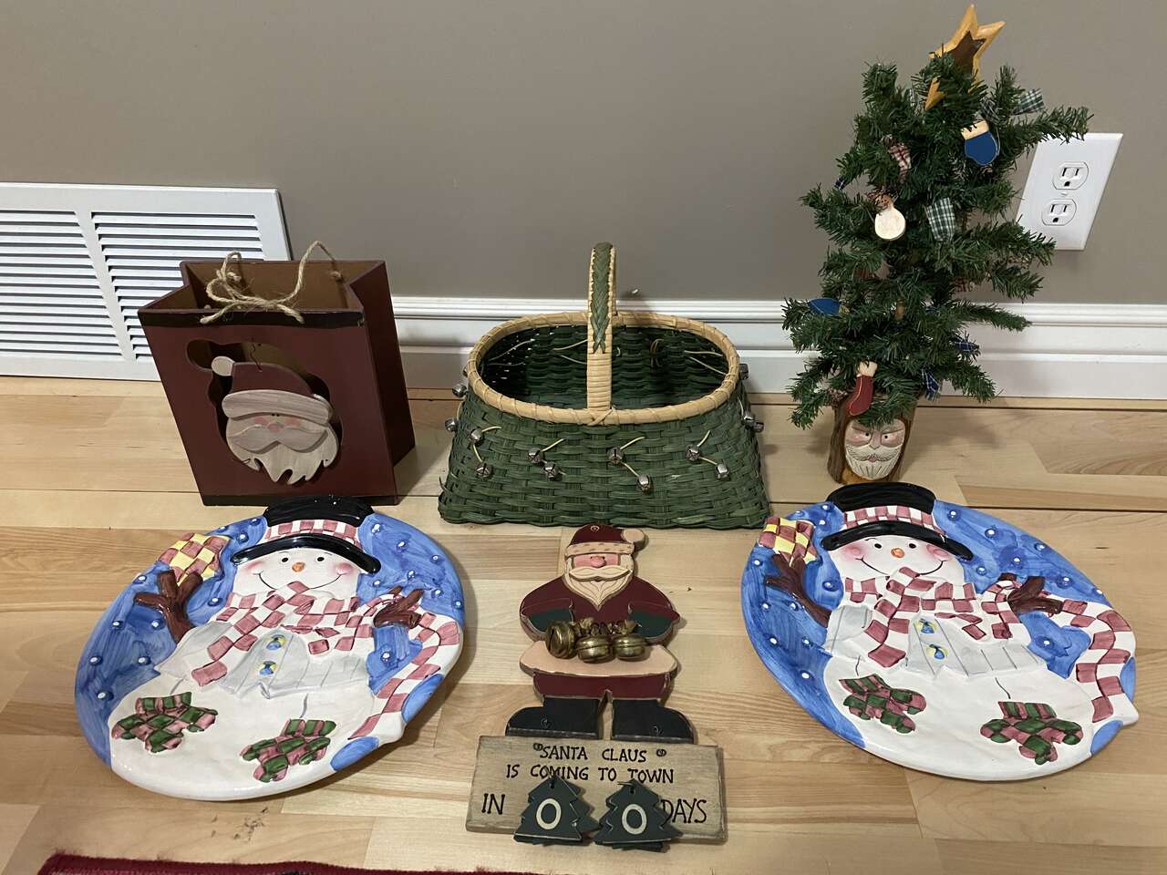 Includes reindeer rug, snowman heavy duty raised detailed extra large plates (set of 2), Santa countdown calendar, Santa wood tree, Santa wood gift box & jingle bell large basket with handle.