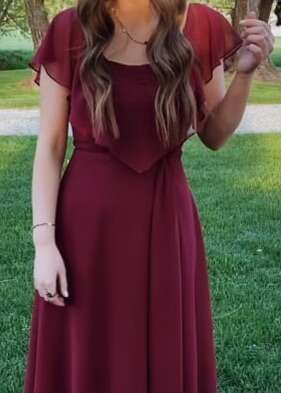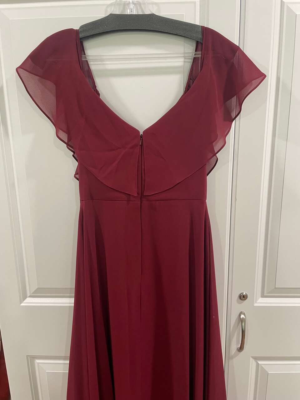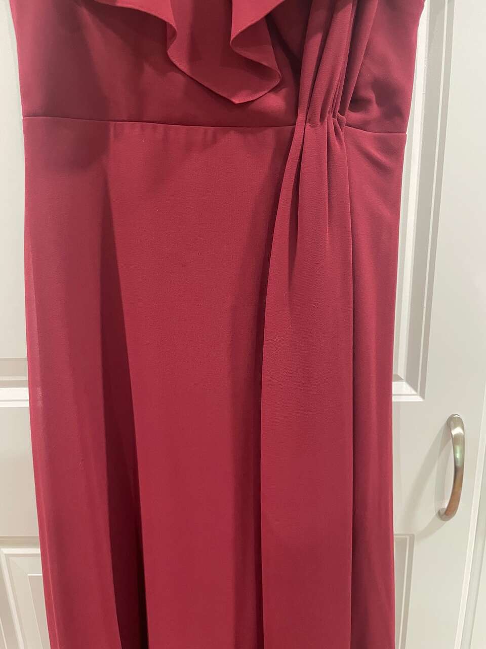 Dress is in beautiful condition. It is a deep burgandy color. It originally came with a full sash but the sash was used to create an extra flowing piece to the front side of the dress as well as to raise the neck line. I am happy to untack it if preferred. It may only have minor pin marks on the sash afterwards. I also have a sea green floor lenth formal dress with bead work on the top. See my other listings. Dress comes from a clean, smoke-free, pet-free home.