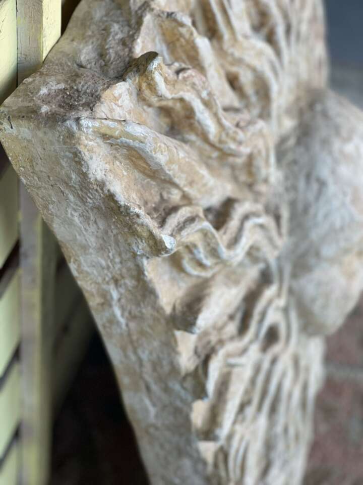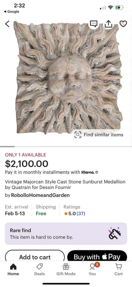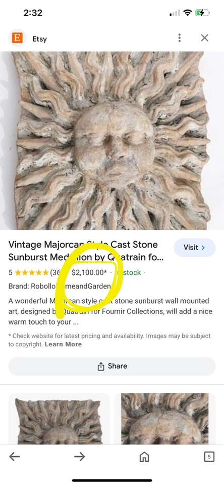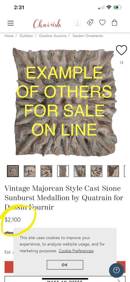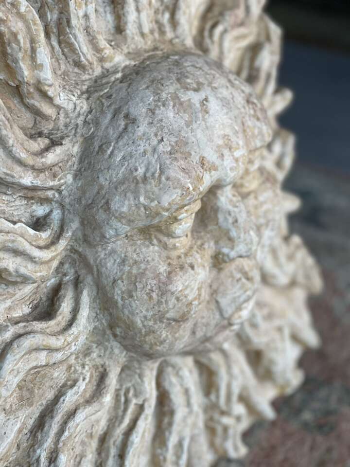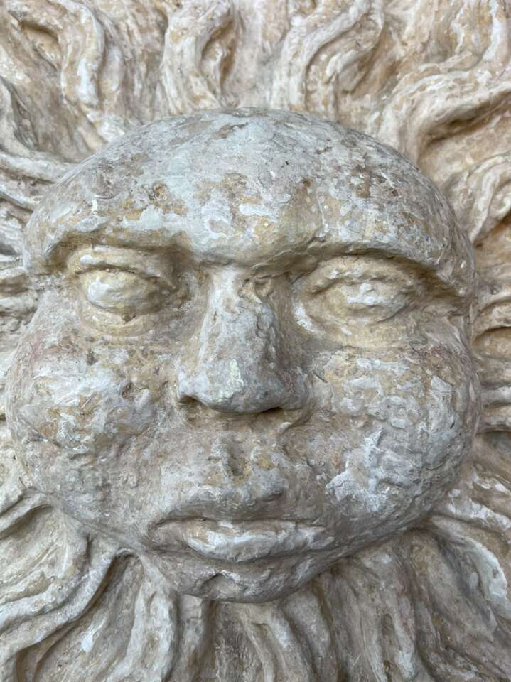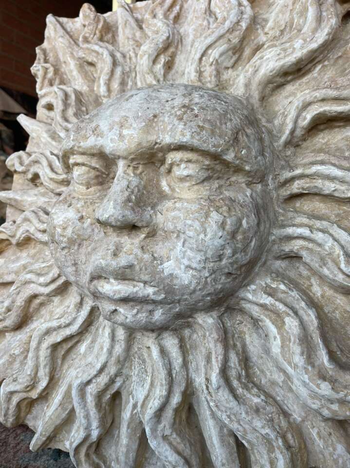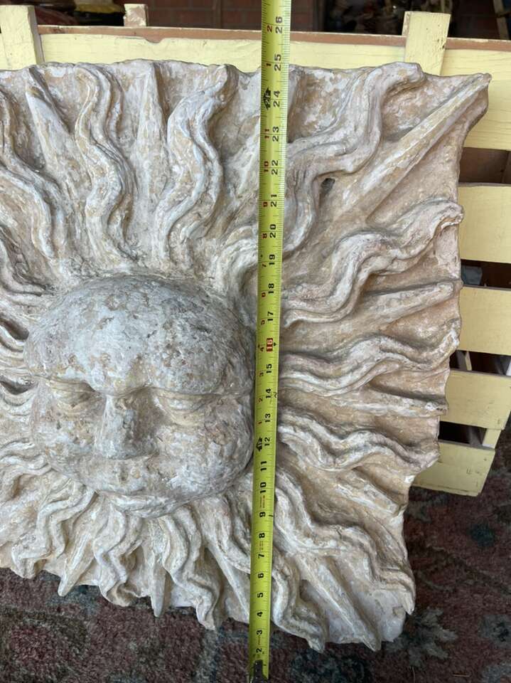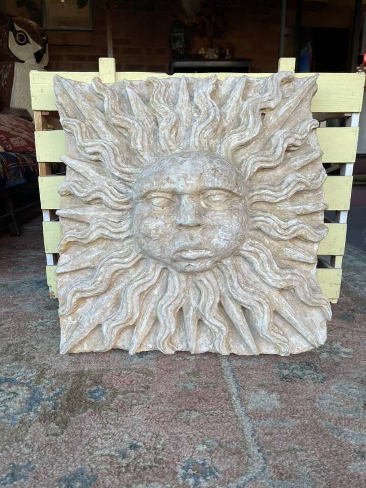 A wonderful Majorcan style cast stone sunburst wall mounted art, designed by Quatrain for Fournir Collections, will add a nice warm touch to your poolside patio or garden. Approximate dimensions are aprox 25W, 25”, 7D inches, and has attached solid iron hanger for easy wall mounting, keep in mind this is a heavy sculpture. This piece gorgeous! Please scroll through the MANY photos I included in this posting and please note the other examples of this item selling on line so you can see what a great deal this is.
