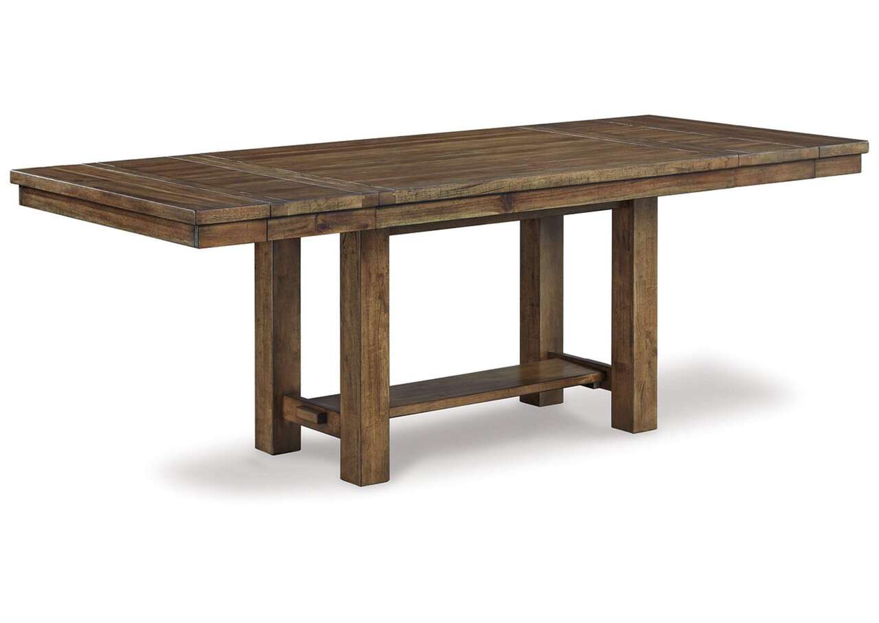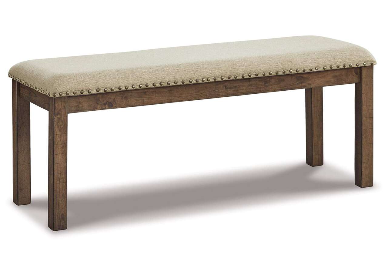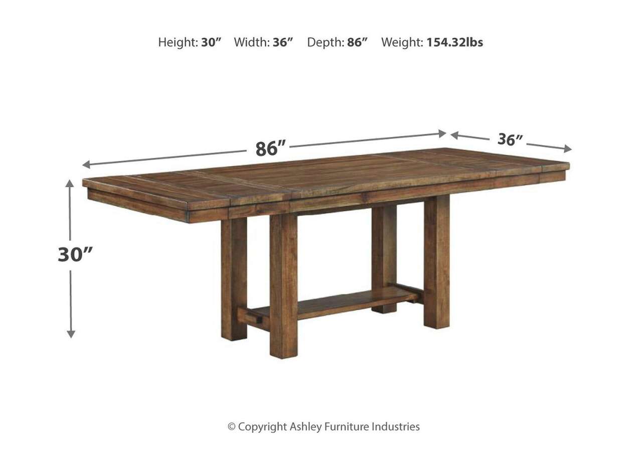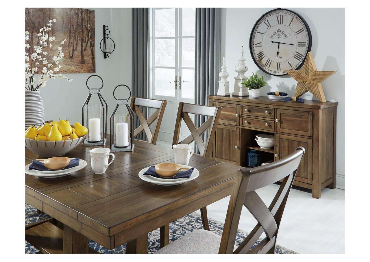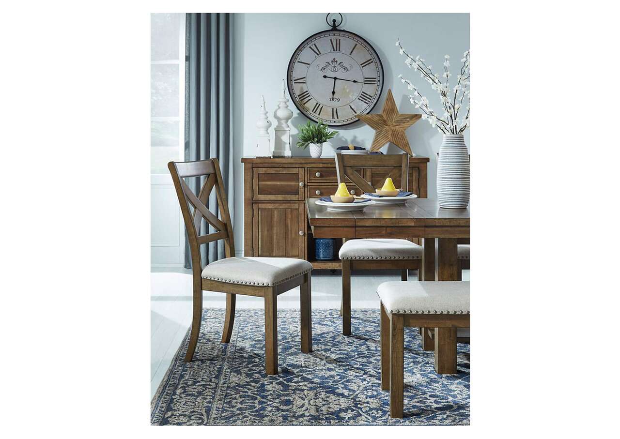This versatile dining room table set elevates the art of casual rustic style. The extension table’s clean-lined, farmhouse profile is beautified with a distressed nutmeg finish and thick planked effect top for added charm. And with not one but two drop-in leaves, you can easily accommodate eight with plenty of elbow room. Cushioned bench and chairs encourage lingering meals enjoyed in comfort.Includes dining table, 4 upholstered chairs and upholstered bench