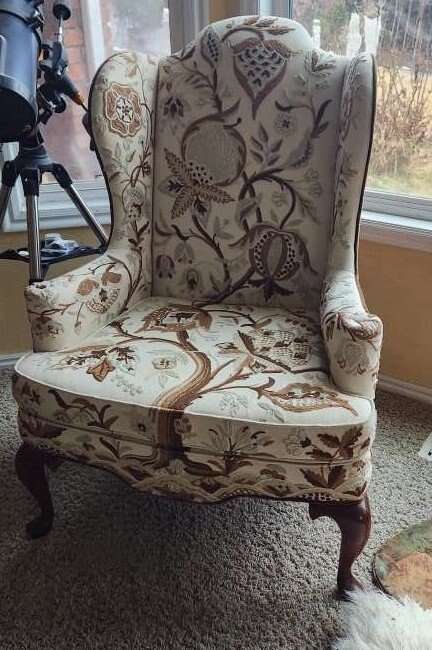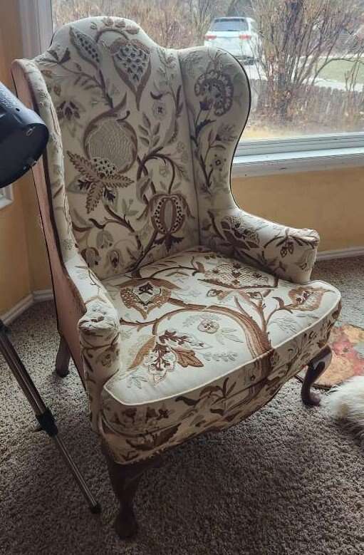 Queen Ann wing chair " Tree of Life" designed by Mary Webb Wood in 1976, signed in crewelwork, cherry, overupholstered frame, rust color velvet backs, with loose cushion ,raised on cabriole legs, labeled.