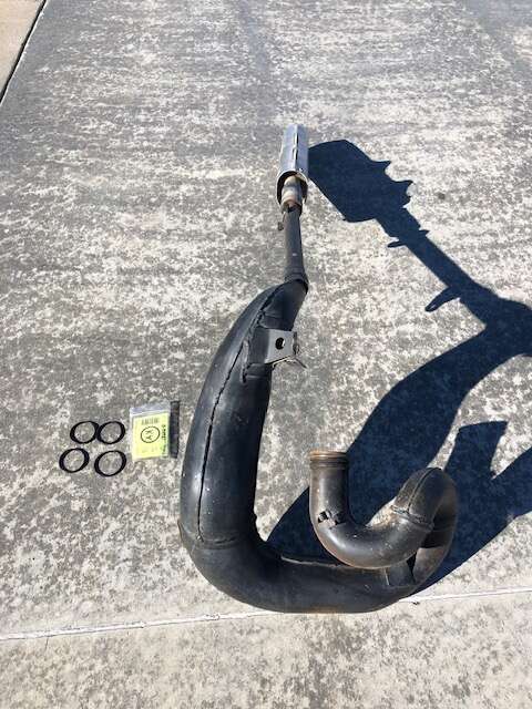 This will fit 1988-2004 KX500. This is a complete OEM system right down to the rubber pads and rubber connector seal. All is in excellent condition. If you are restoring a KX500 this might be the best condition system out there and may be the only complete OEM Factory set for sale anywhere. Also comes with 4 new rubber o-rings to seal it at the head. This is not a mixed macthed set, i took this off my 1989 KX500 early on, so it is what came on the bike from the factory. $1,000.00... Cash Only... No Checks... No Codes... No Venmo.