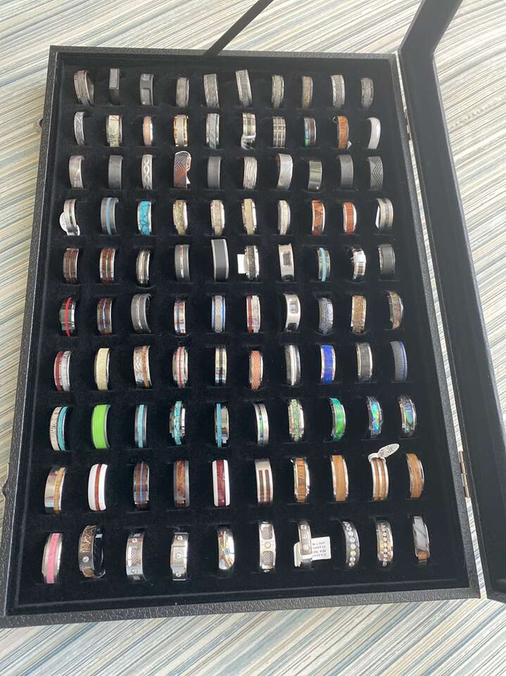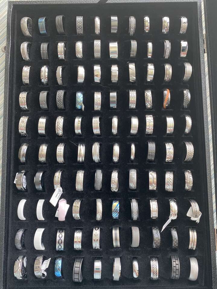 We sell beautiful men’s rings including tungsten, titanium, cobalt, zirconium, ceramic, and more for $30. We also have beautiful inlays made of wood, shell, camo and more for $50. We also have meteorite inlays for $150. Lastly, we carry silicone rings 1 for $10 or 3 for $20. We have sizes 4 and up. Huge selection. We do not carry any gold.