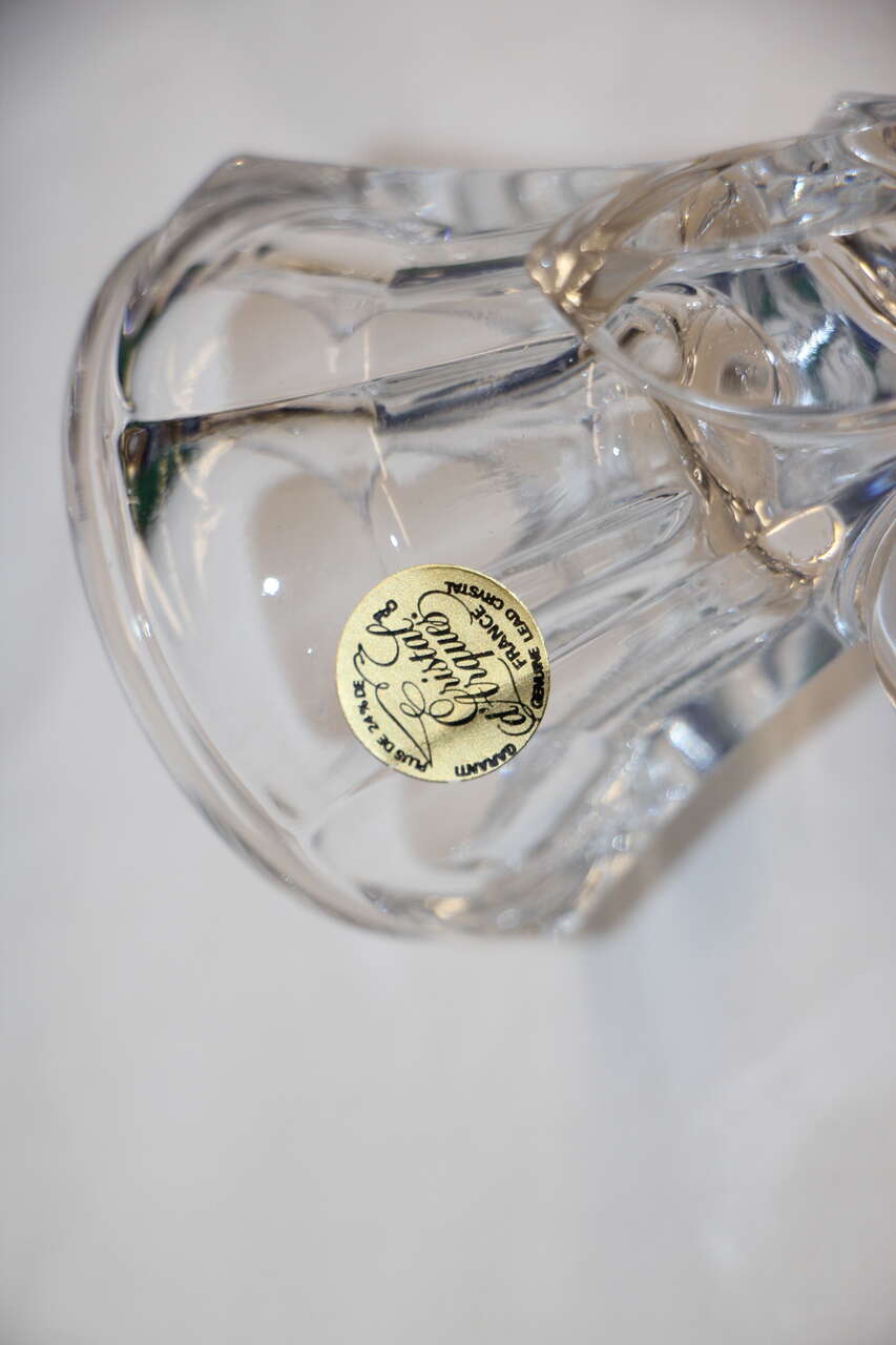 Lead crystal candle stick holders made by Cristal D'Argues in France. 8 1/4" tall, resemble a flow that is blossoming. New in box. Offers considered.