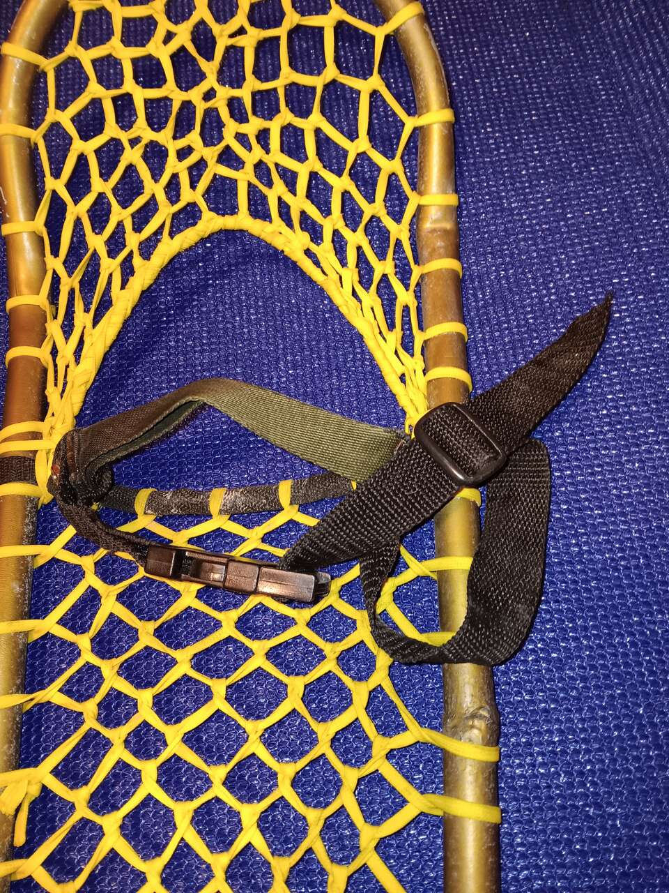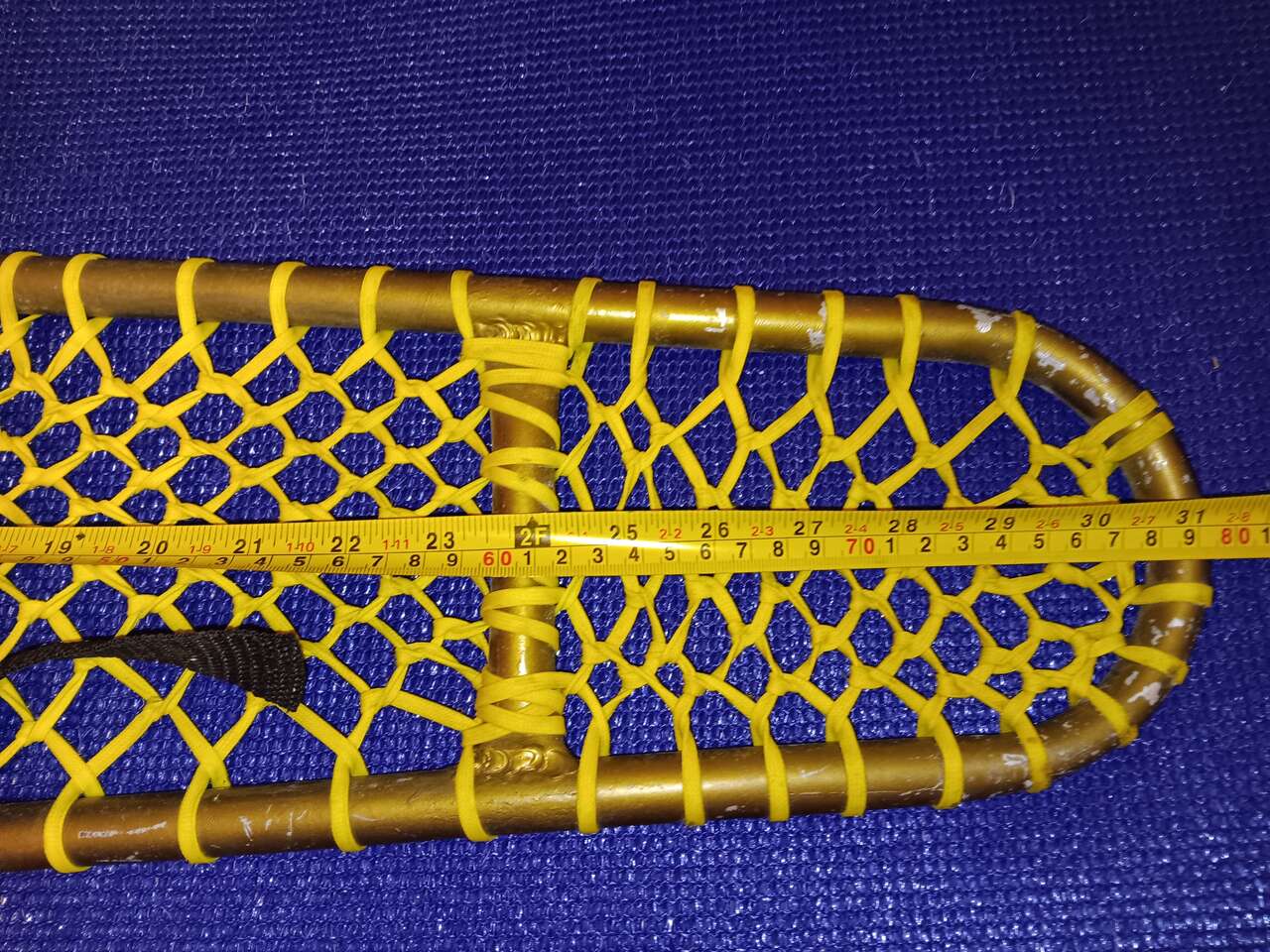 Aluminum frame, yellow webbing, and adjustable boot straps, 19 inch in length.