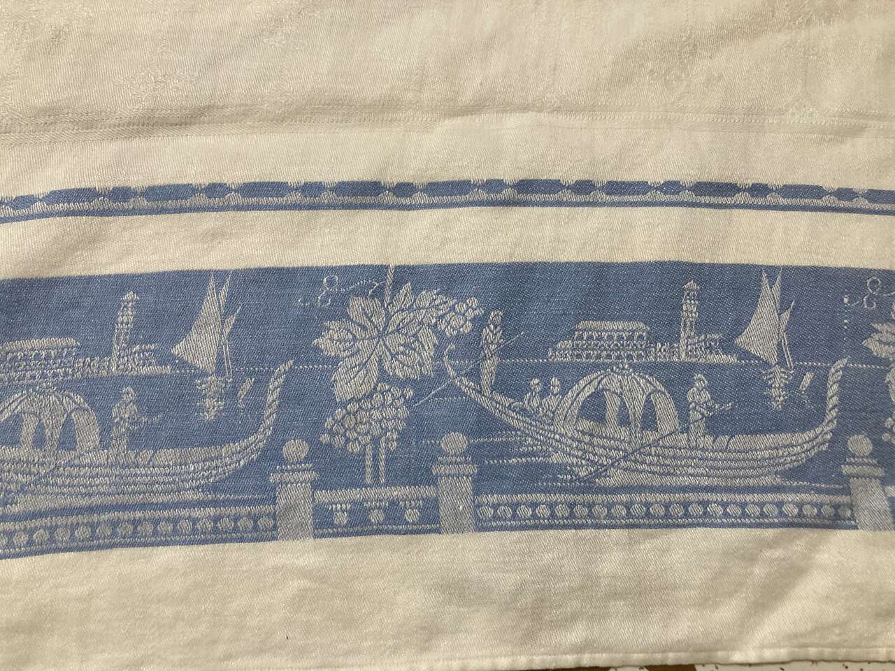VenmoVintage tablecloth, blue gondolas and grapes border this off white cloth. I believe scene is of Venice, Italy. Measures 50"x50" several yellow stains, overall still in beautiful condition. Please see more by seller for other Italian and/or Italy items. Items from family home and our own, many collectibles.