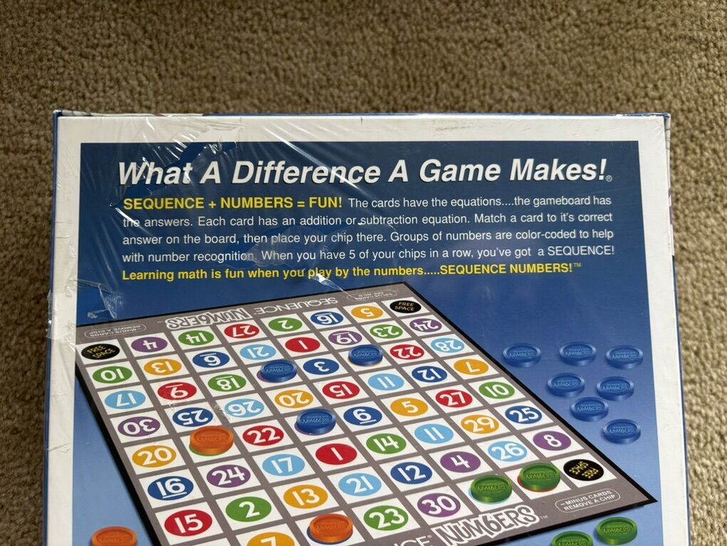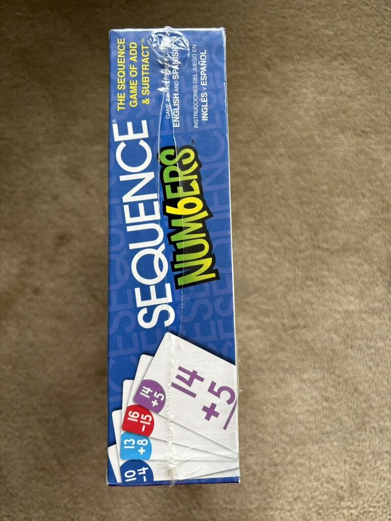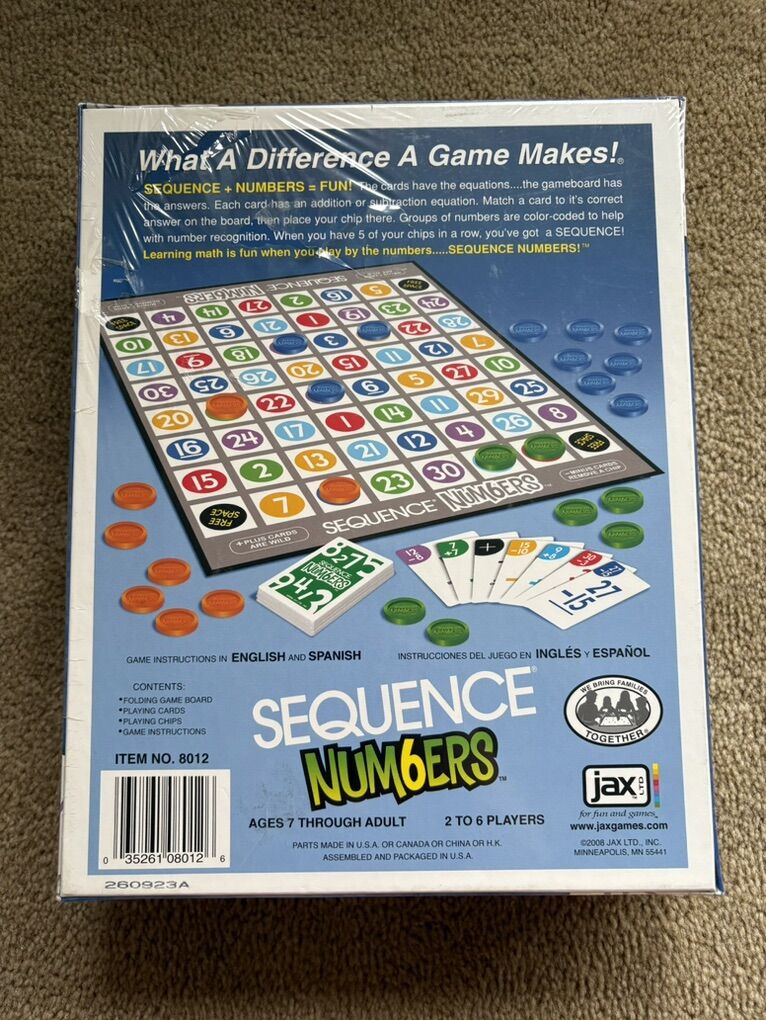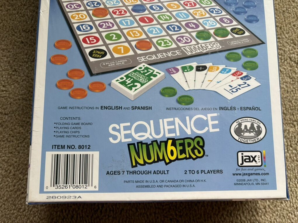 NEW (sealed in plastic) Sequence: Numbers. The Sequence game of add & subtract. Ages 7+, 2-6 players. By Jax Games, 2008. New, unopened condition. Plastic slightly torn (see photos). Text only. Cash or Venmo.