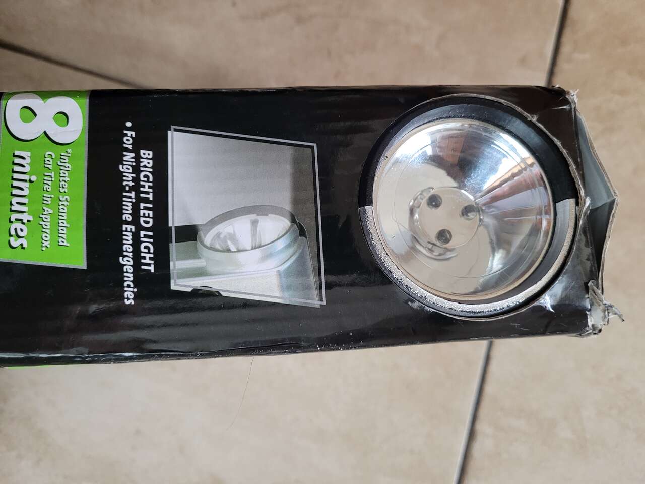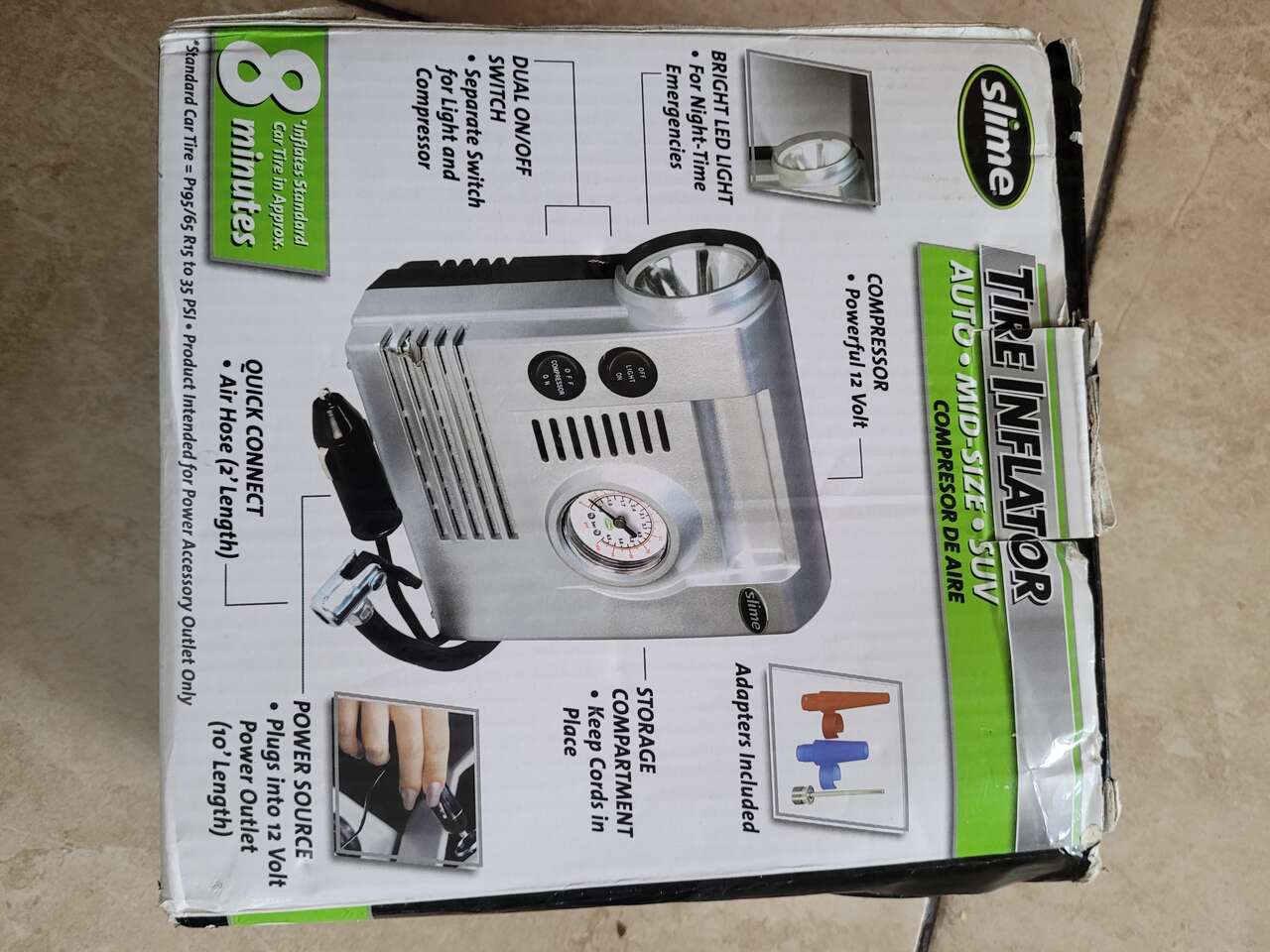 SLIME TIRE INFLATOR. BRIGHT LED LIGHT FOR NIGHT TIME EMERGENCIES. POWERFUL 12 VOLT COMPRESSOR. DUAL ON/OFF SWITCH. LIKE BRAND NEW.