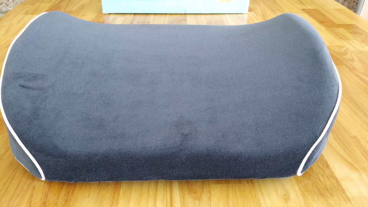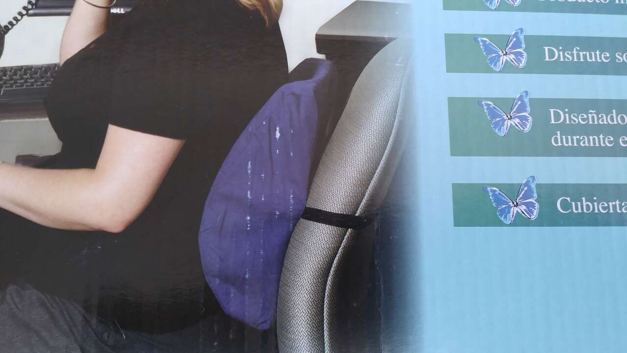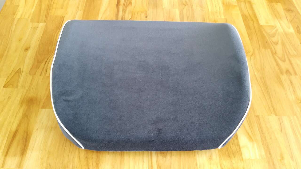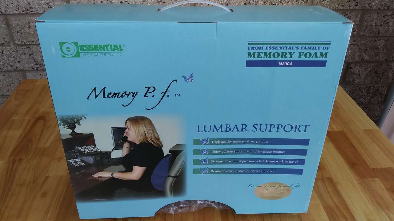 VenmoMade by Essential Medical Supply, Back Support Lumbar Pillow N3004, with a strap for the chair back, grey velvety material. Measures about 15 ½ inches across x 13 ½ inches top to bottom and 4 inches at its thickest part. New in box.