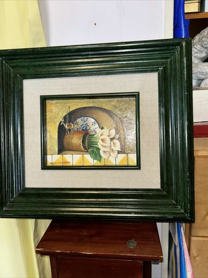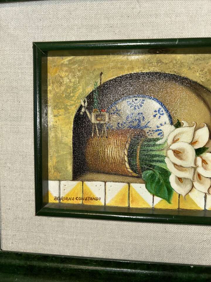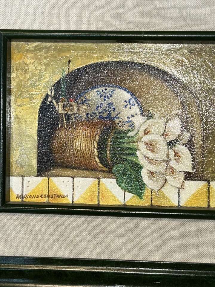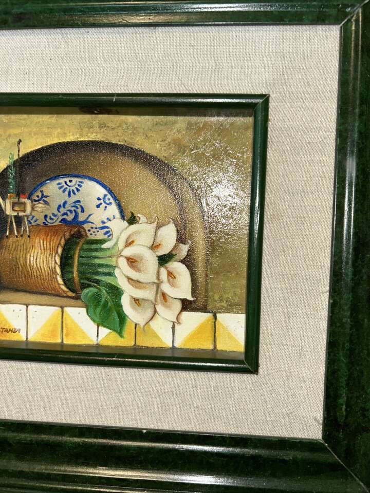 Venmooriginal artist signed oil on canvas still life fireplace lily