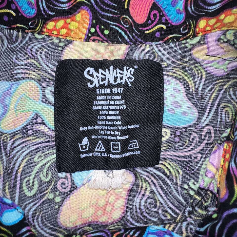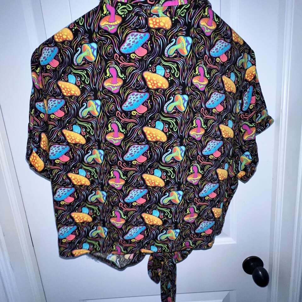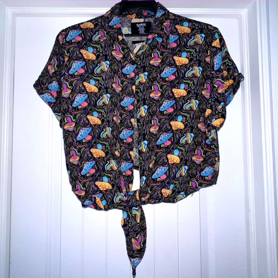 It's all about PLUR. This trippy mushroom button down shirt features so many colors, there's no doubt you'll stand out in the crowd. The tie detail adds a cute little touch to this collared shirt and will enhance the cropped hem perfectly. Short sleeves with button down closure.
