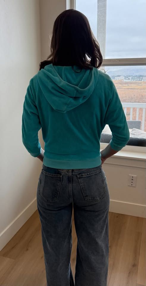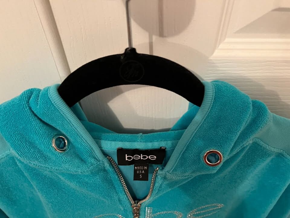 Elevate your loungewear with this stunning bebe velour jacket! In a gorgeous, vibrant Venetian Teal, this piece brings those iconic early 2000s vibes straight to your wardrobe.