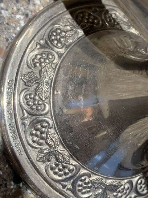 With grape vines around the base. Approx. 6" high and 5 3/4" wide.