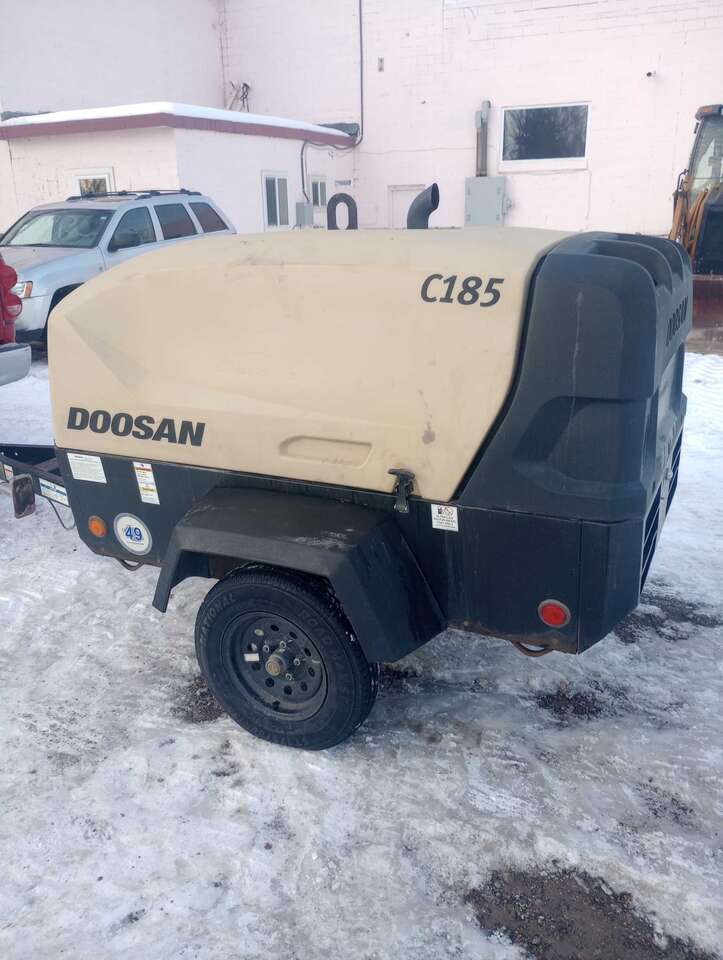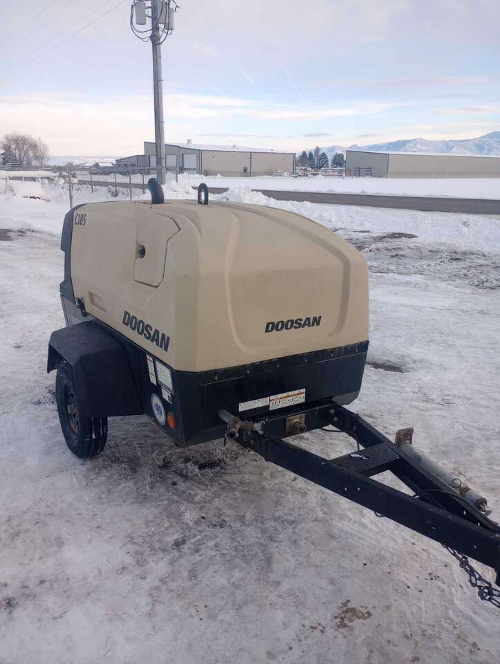 Doosan c185 towable air compressor, Doosan 49 hp 3 cylinder diesel engine, 185 cfm, 100 psi rated operating pressure. 34.5 gallon tank. Over 12 hours of run time at a full load. Great air compressors that will get the job done! Give Rex a call with any questions! Give him a call with any of your equipment needs. (208) 431-9125