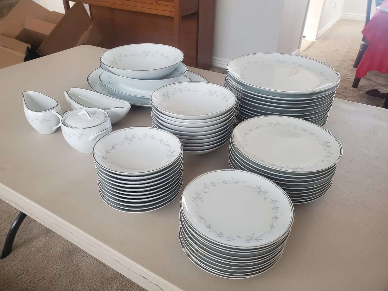 Set Includes: 12- 10.5 inch Dinner Plates (2 are chipped). 10- 7.5 inch Dessert Plates (1 is chipped). 11- 6 inch Salad Plates (1 is chipped). 11-5.5 inch Bowls (1 is chipped). 10- 7 inch Bowls (1 is chipped). 16 inch Oval Platter. 12 inch Oval Platter. 10.5 inch Oval Serving Bowl. 9.5 inch Round Serving Bowl. Sugar Bowl w/ lid. Small Pourer. Gravy Boat.