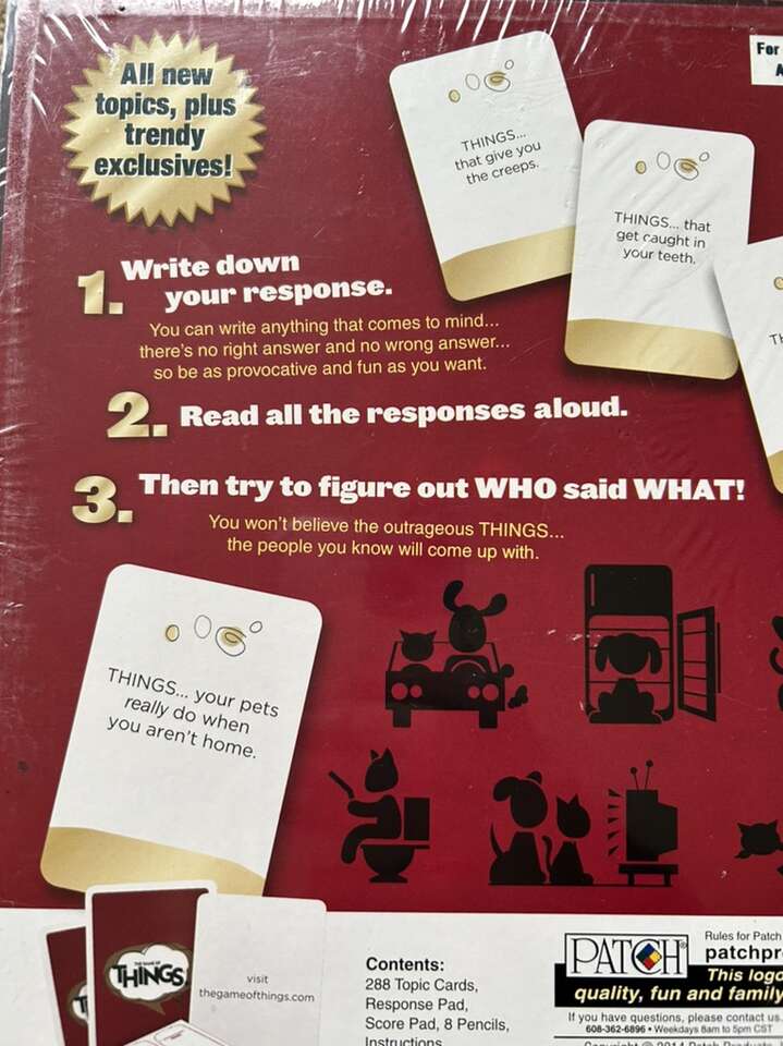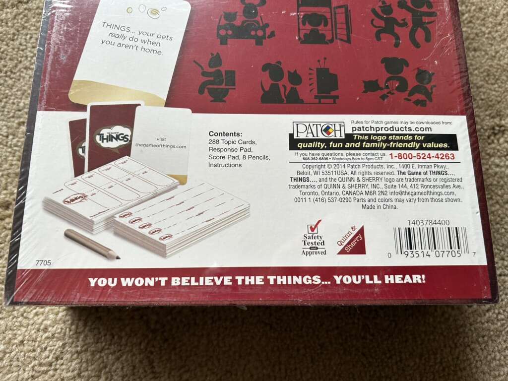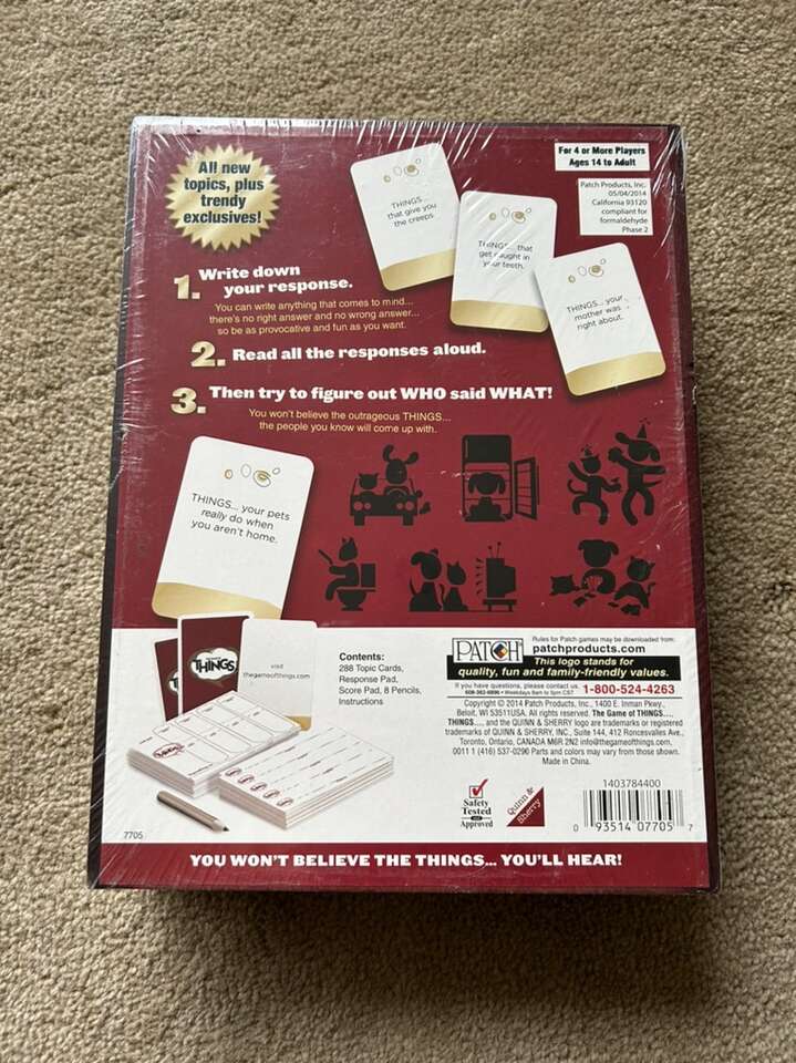NEW (sealed in plastic) The Game of Things: Humor in a Box! Pick a topic, write a response, guess who said what. 10th anniversary limited edition, in a collector’s wooden box. 4+ players, ages 14+. By Patch Games, 2014. New, unused condition. Text only. Cash or Venmo.