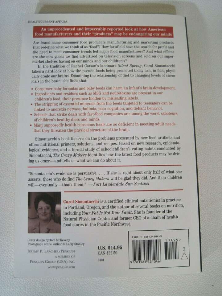 Based on extensive research, epidemiological evidence, and a formal study of schoolchildren's eating habits, The Crazy Makers identifies how the latest food products may be literally driving us crazy. Carol Simontacchi offers the reader nutritional primers and recipes to help counteract the problems facing us and our children every time we sit down to eat.