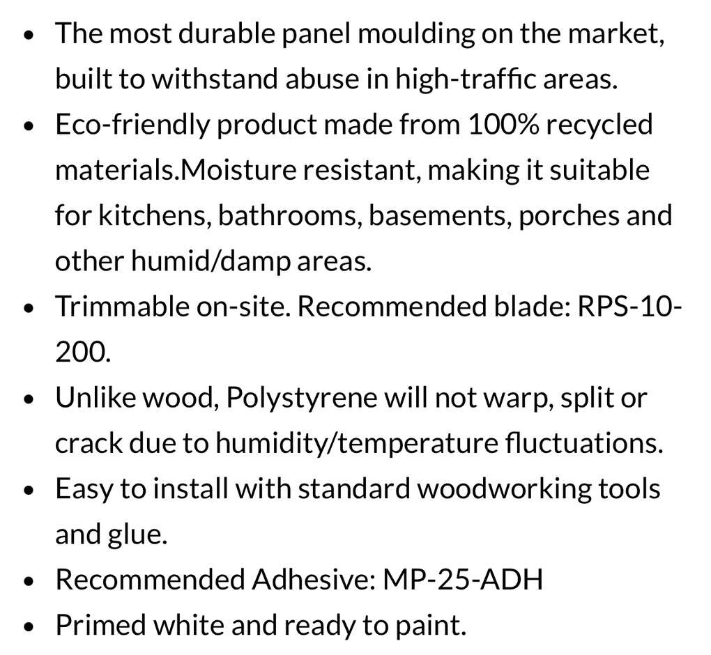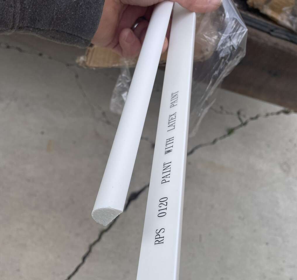 Description- CASE OF 52 pieces of 8’ long (416 linear feet) of 1” x 1/2” half round wall/ceiling trim moulding. These are pre-primed, paintable, trimmable, durable plastic, which will not warp or split like wood. See photos for more product information and specifications.