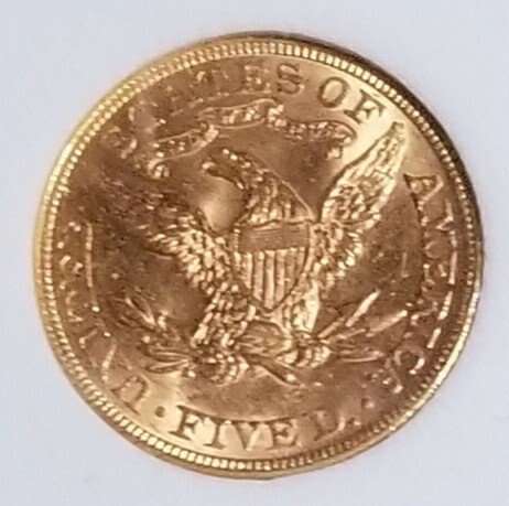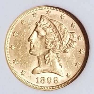 Very very rare in this condition. 1898 MS67 gold half eagle. The highest grade that can be given is MS70. That is an absolutely perfect coin. MS67 in coins from the 19th century are extremely rare. They do not even have a column for MS67 for these gold coins in the US Redbook of coins.