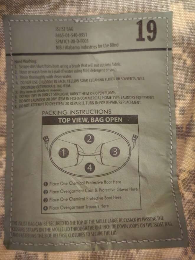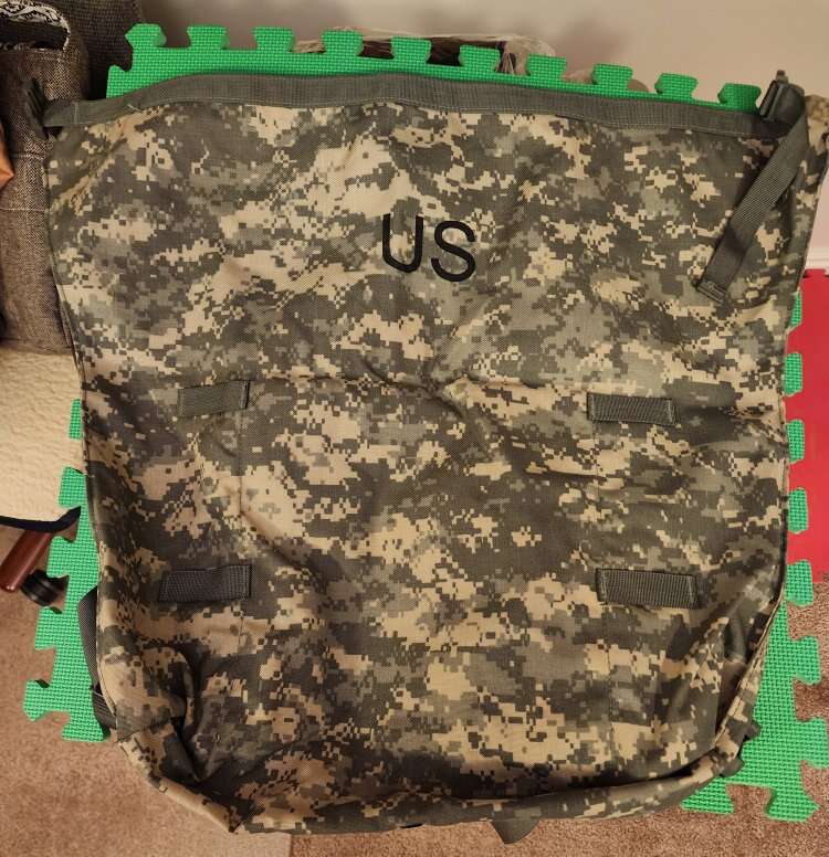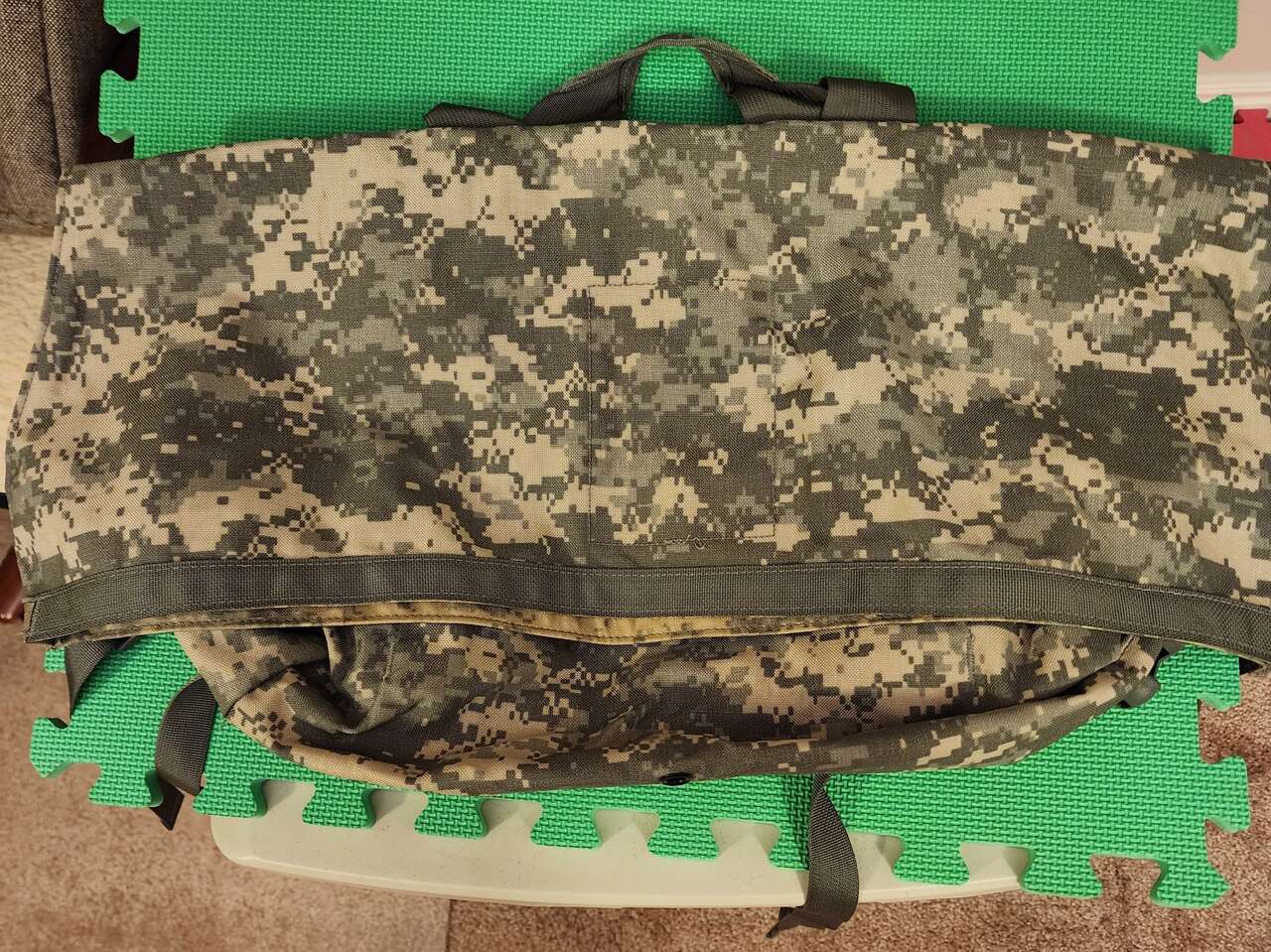 Very large, camo canvas with compartments. Handle and straps for securing and carrying.