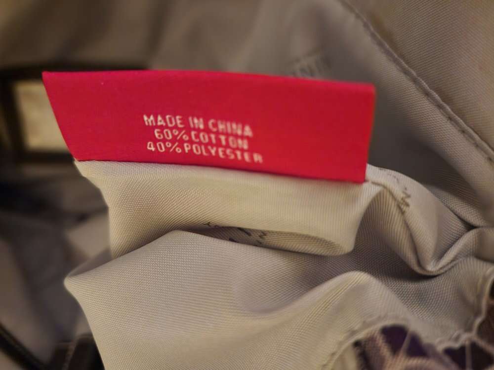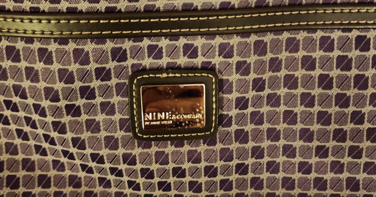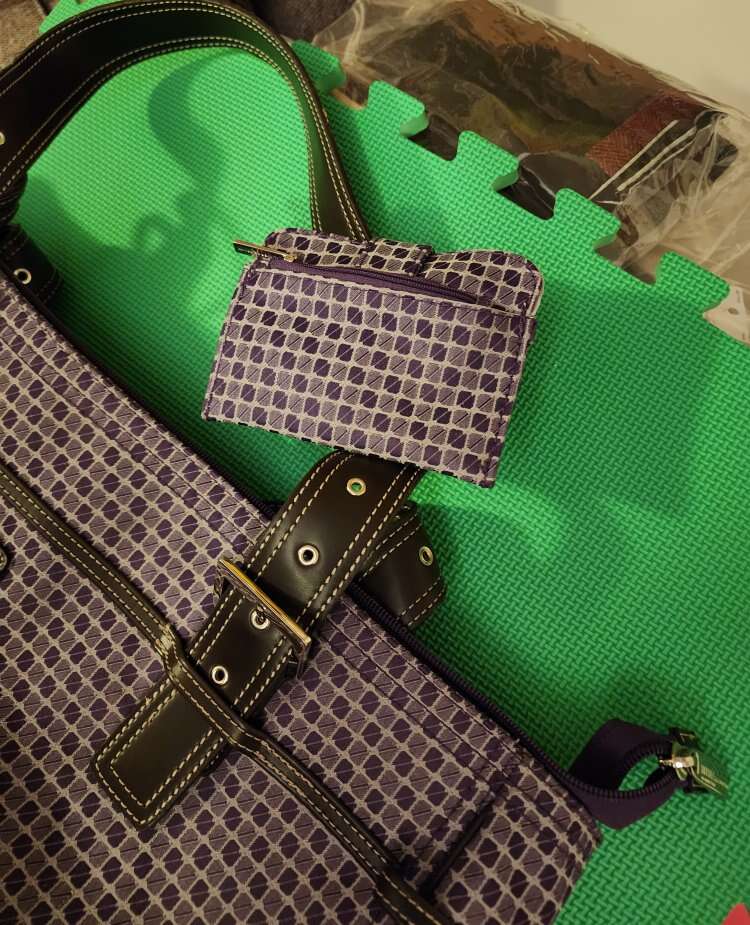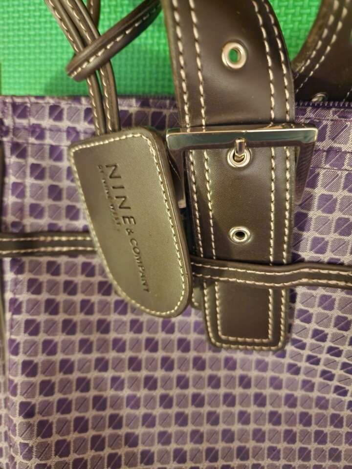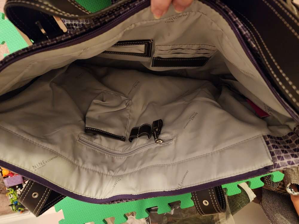 Very large, very nice. Purple with pockets inside for personal or business needs.