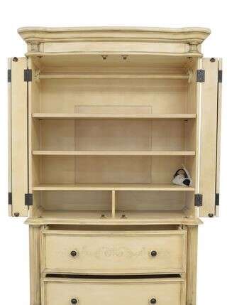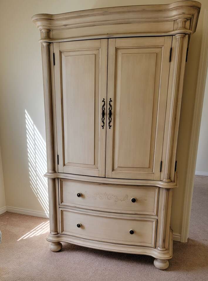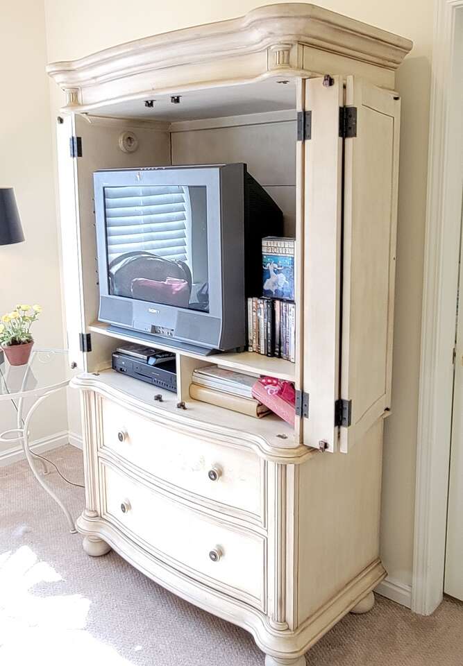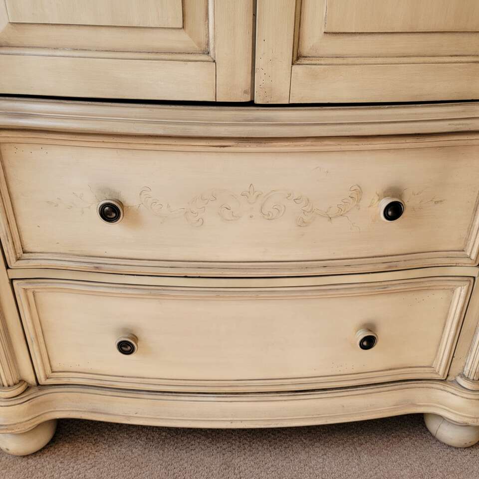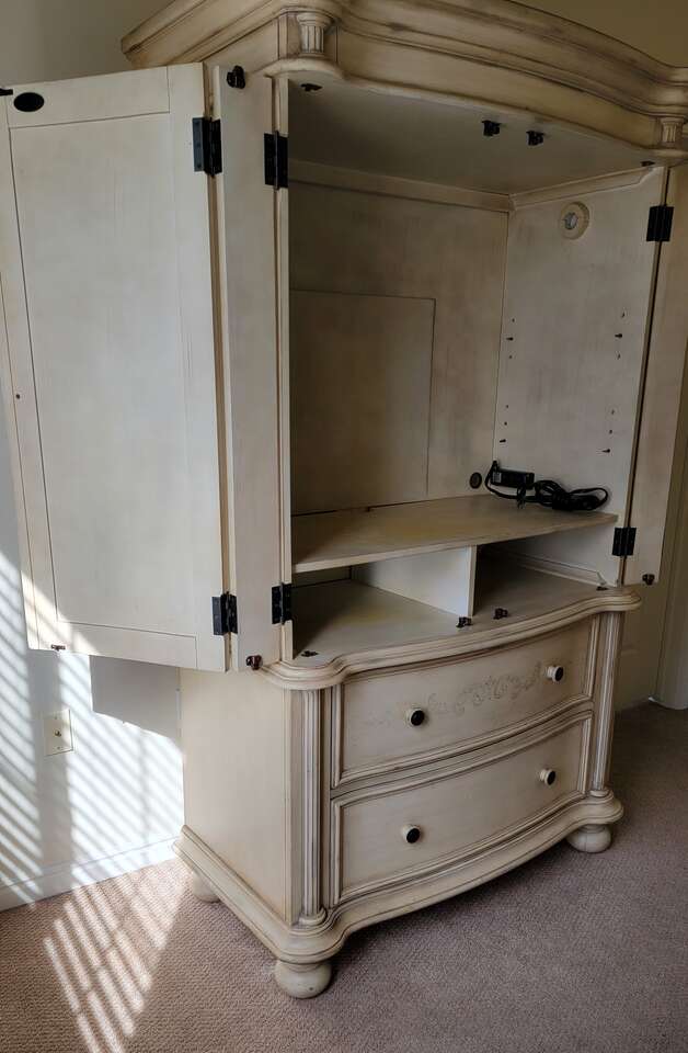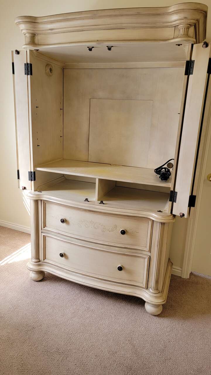 You can remove the panel from the back for media or add a clothing bar to suit your needs. This armoire is in beautiful shape! It is hand painted in an Italian style with antiqued finish, crown moldings, metal hardware, and media compartments. Measuring at the widest and deepest points its dimensions are approximately 79" T x 45" W x 24" D. It features access holes for cords and a two-outlet power source with a two cable TV hook-up. It is very well constructed and very heavy - about 300 pounds. Local pickup only, but no stairs to deal with. Buyer must have ability to move the armoire. Cash or Venmo only! Coming from a very clean, non- smoking home.