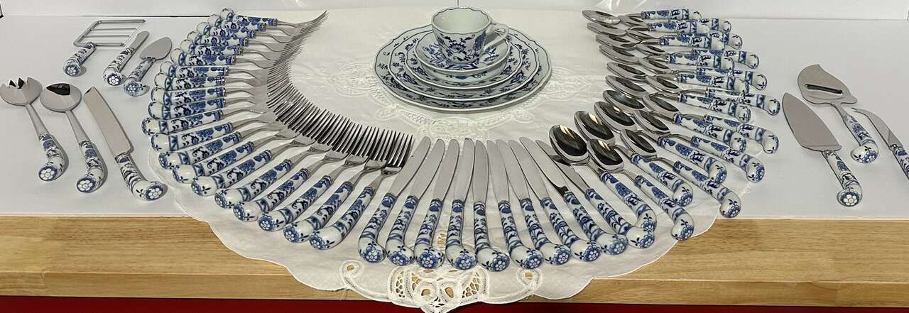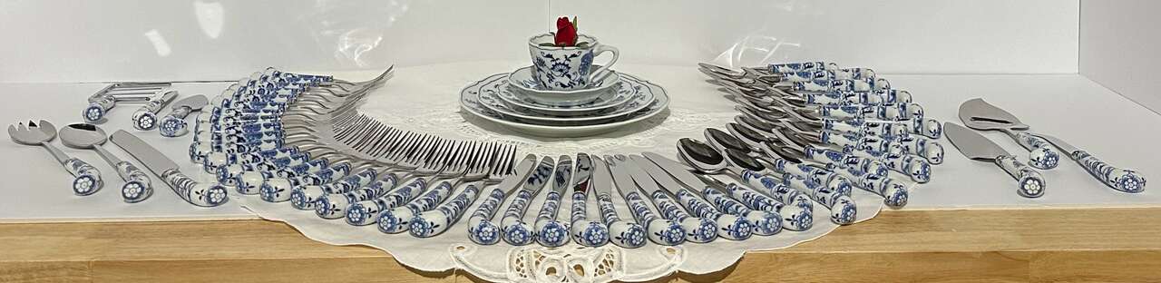 2 Candlesticks/2 Candles~from Holland/1 Divided (two sided) Serving Bowl/1 Oval Platter~Blue Danube~ 12"/1 Lattice CakePlatter/1 Pie Plate/1 Set of 5 of Hand painted Blue Delft Cannisters/Extra pieces of Blue Danube (1)Large dinner plate (1)Coffee cup(2)Coffee saucers (1) Bread and Butter Plate. /Set of 50 Pieces (10 Place Setting) of Vintage Rare Delft~(Sheffield is metal part)_10 Knives_10 Forks_10 Salad Forks_10 Soup Spoons*10 Teaspoons