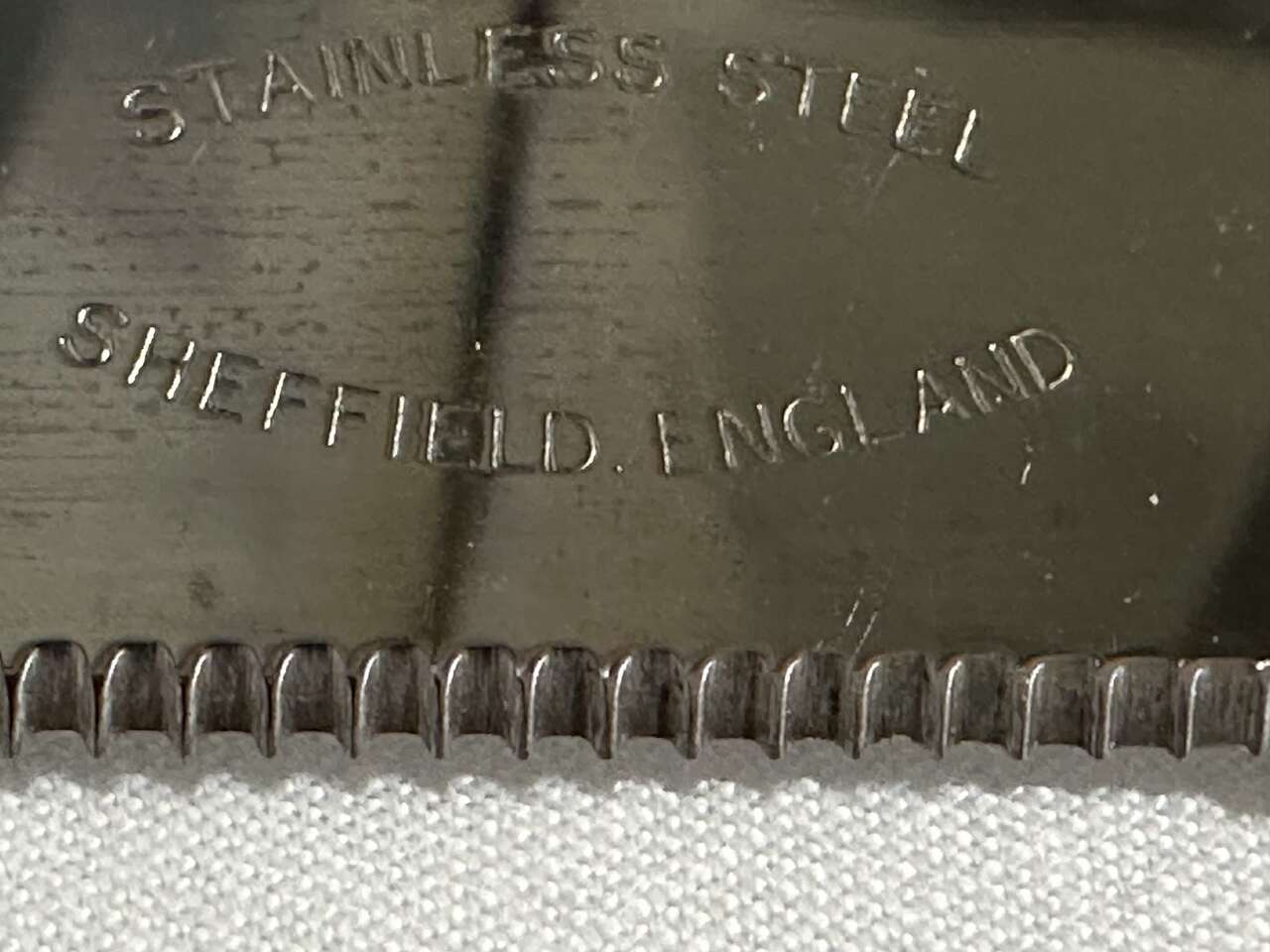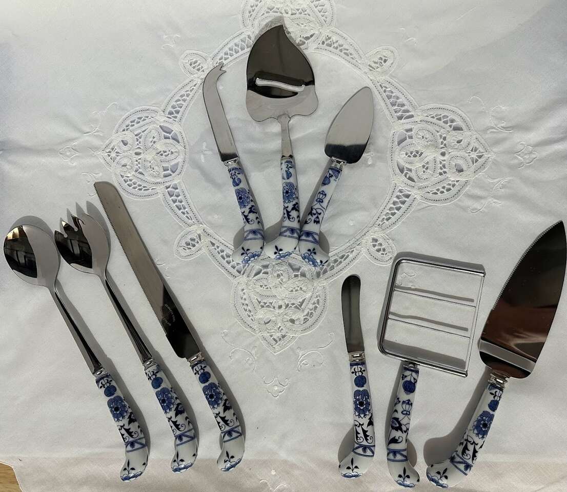 9 Pieces of Vintage Delft Flatware serving set~ Sheffield England is (metal part)//~Long salad spoon~Long salad fork~Long carving knife or for cake cutting~Butter Knife~Wire cheese slicer~Pie Slicer~Prong Knife~Cheese slicer server~Soft Cheese Spreader~Pie slicer~Prong knife