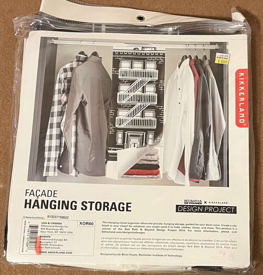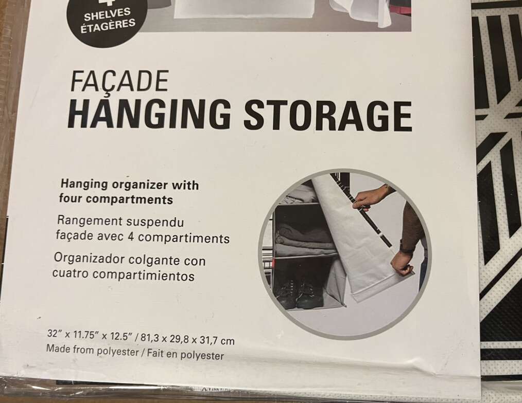 Never used hanging storage/Organizer with 4 compartments. Protects your clothes, shoes and more from dust and sunlight, perfect for dorm room/ small apartments. It is 32” x 11,7” x 12,5”. $8 each of $15 for both.