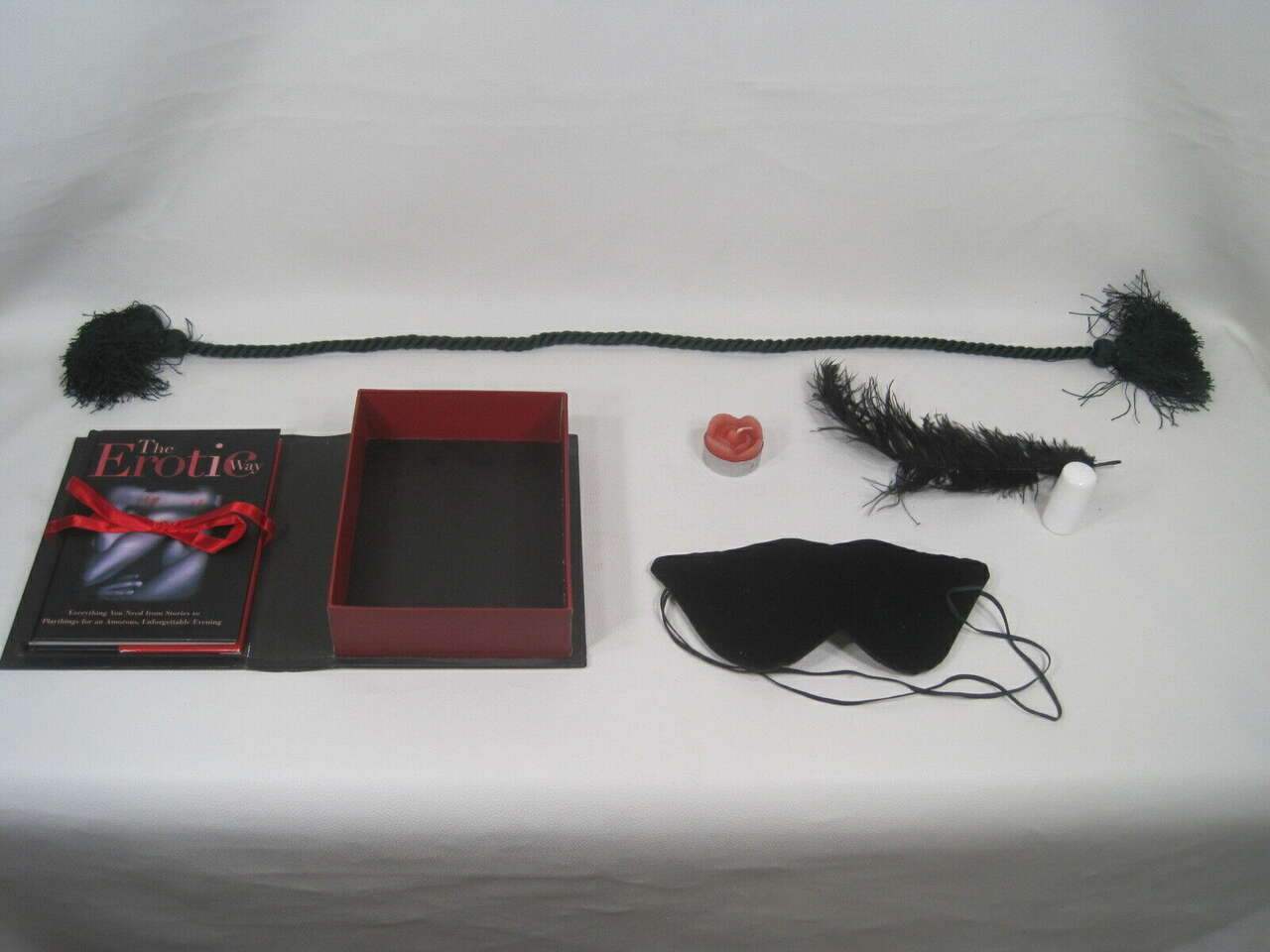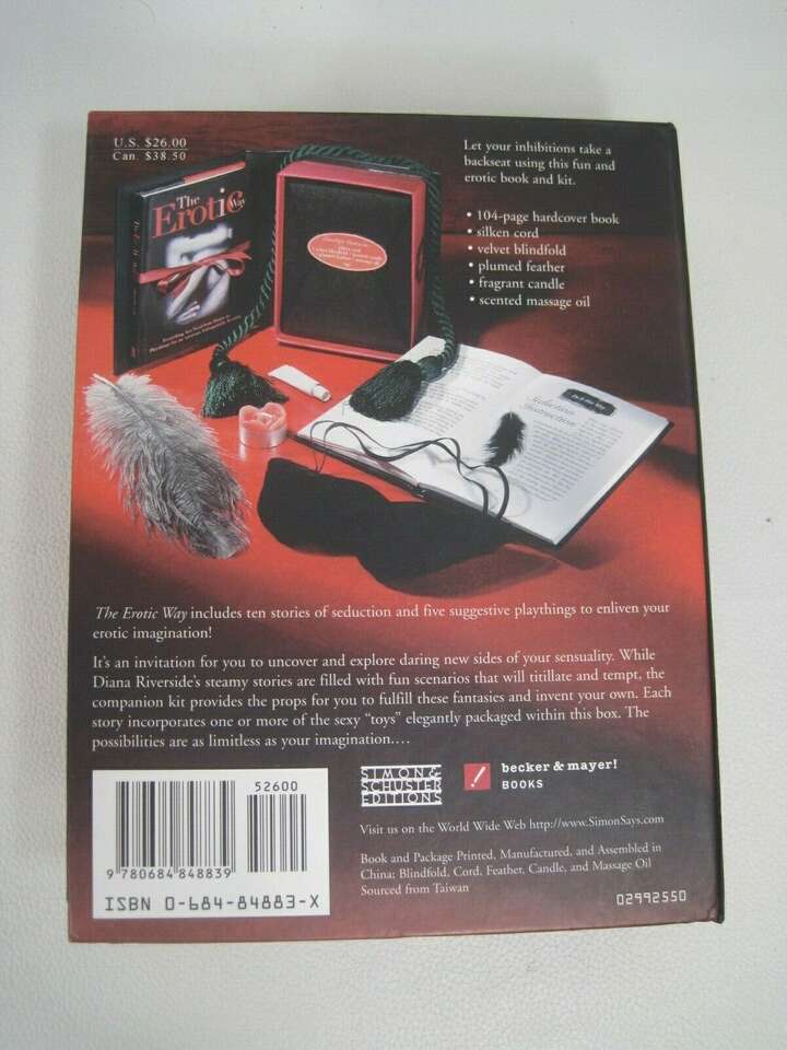 Let your inhibitions take a backseat using this fun and erotic book and kit. 104-page hardcover book silken cord velvet blindfold plumed feather fragrant candle Scented massage oil The Erotic Way includes ten stories of seduction and five suggestive playthings to enliven your erotic imagination! It's an invitation for you to uncover and explore daring new sides of your sensuality. While Diana Riverside's steamy stories are filled with fun scenarios that will titillate and tempt, the companion kit provides the props for you to fulfill these fantasies and invent your own. Each story incorporates one or more of the sexy "toys" elegantly packaged within this box. The possibilities are as limitless as your imagination...