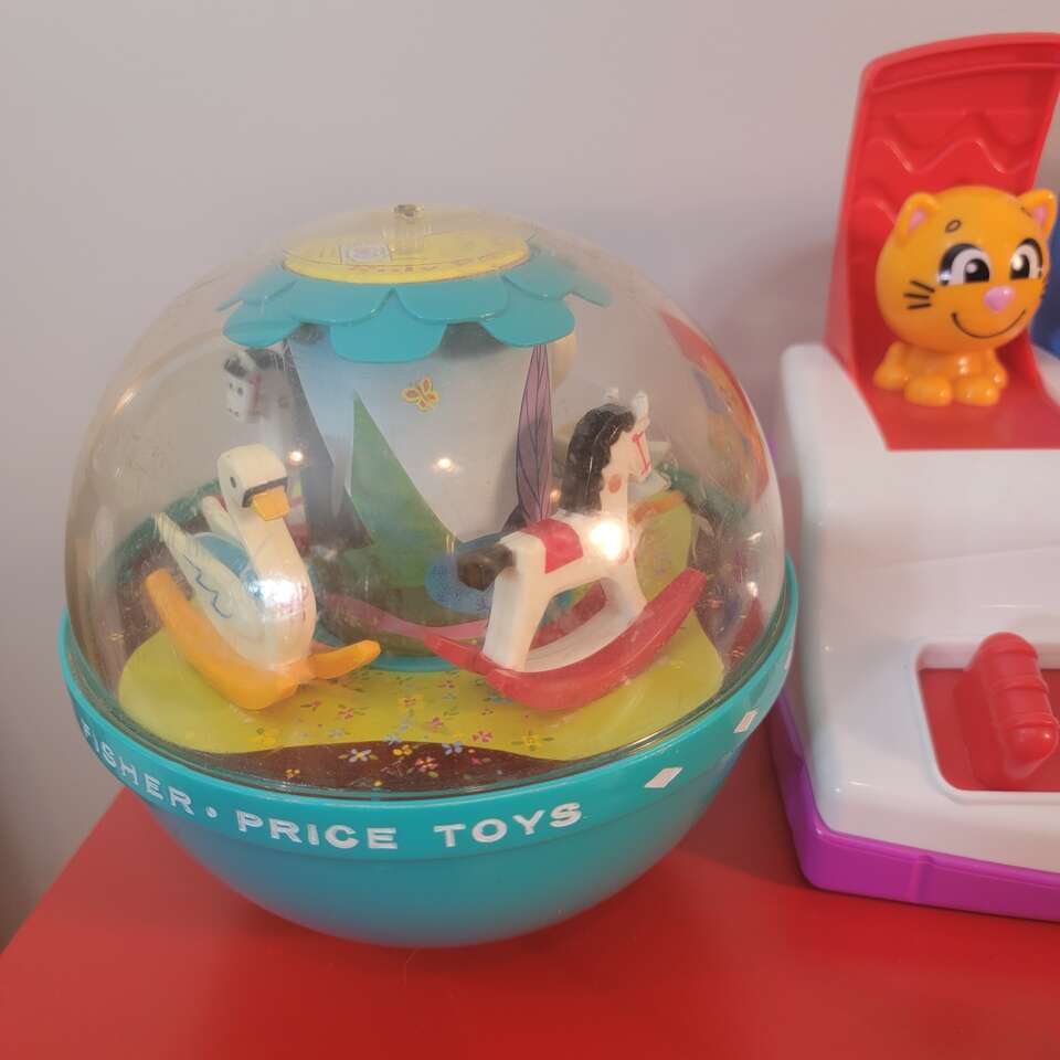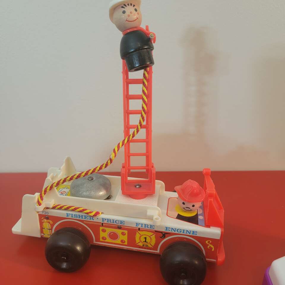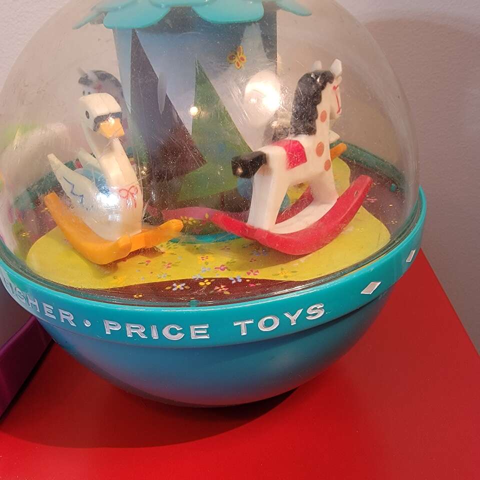 Vintage Fisher Price Toys Including: Including: Vintage Fisher Price Fisher Price Tote-A-Music Box Radio, Plays When you Wish Upon a Star when the knob is turned. 1970s Vintage Fisher Price Roly Poly Chime Ball Rocking Swans & Horses 6"x6" #165. 1970s Vintage Fisher Price ‘Little People” Play Family Fire Engine with fireman who climbs the ladder with the fire hose #720. 1970s Vintage Fisher Price Brilliant Basics Bobble & Giggle Pals Pop Up Animals Baby Toy 11.25" wide. The doors pop open when the triggers on the bottom are activated. Each trigger operates in a different way. All features are in working order when sound effects are triggered. The battery compartment is clean. Coming from a clean smoke free home. Cash or Venmo. Thank you for looking!
