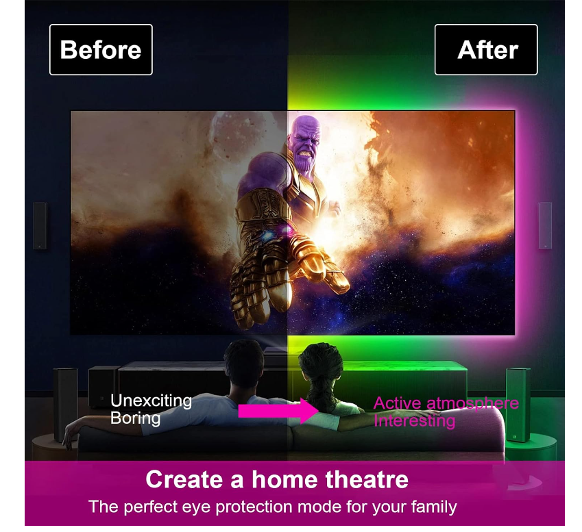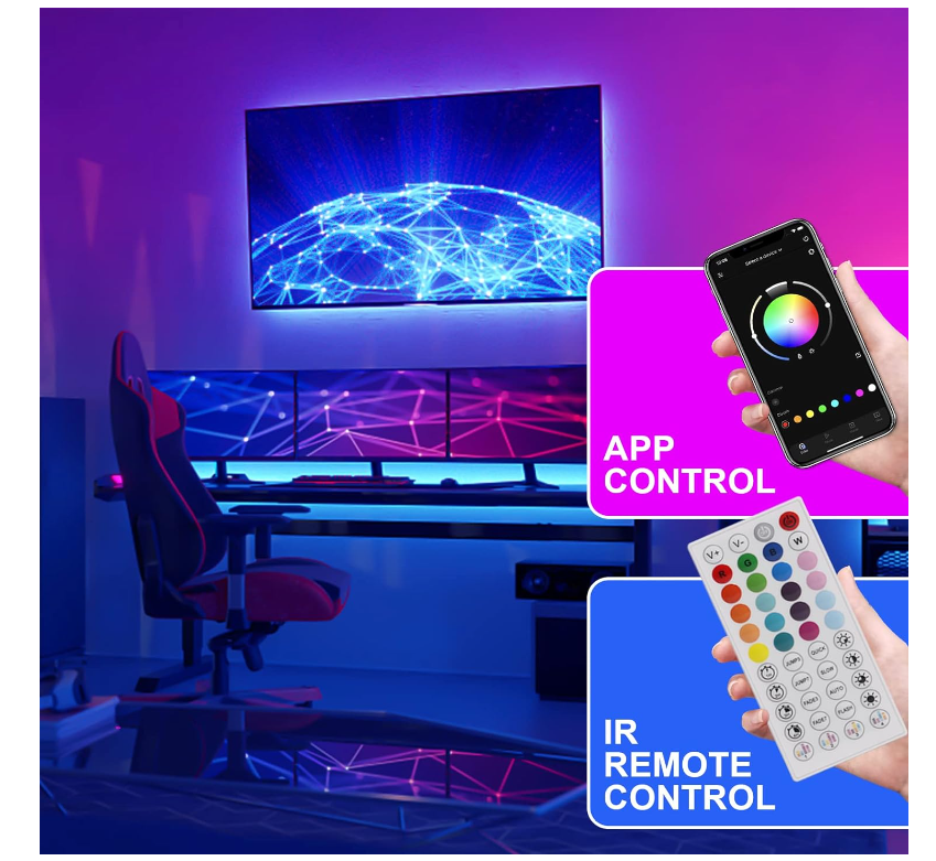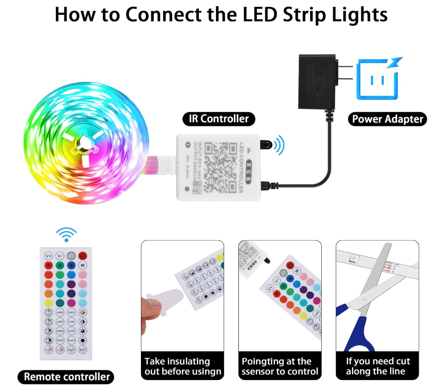 ApplePaySmart APP & IR RemoteThe Led strip light can freely control thousands of colors through infrared remote control or phone APP,28 dynamic modes and DIY color options,you can select or define your own color,apply to wherever like bedrooms, playhouse, living rooms, kitchens, parties, weddings, Christmas, Halloween, etc Smart Music SyncRGB Led strip lights have smart music mode, the built-in highly sensitive mic makes the light strip can dance to the music tempo, changing color sync with the rhythm of sound, which can ignite the ambience especially of a party or when you indulge in the computer game playing. Smart Timer Function Via the smart App, our RGB LED strip lights allow you to preset on & off times. The led lights perfect for use before sleep or automatically switching a special awakening surprise. Easy to Use and InstallOne roll of 32.8ft LED strip light are long enough to decorating your room and available to be cut to your desired length along the cutting marks.Pay attention that the lights are not waterproof.