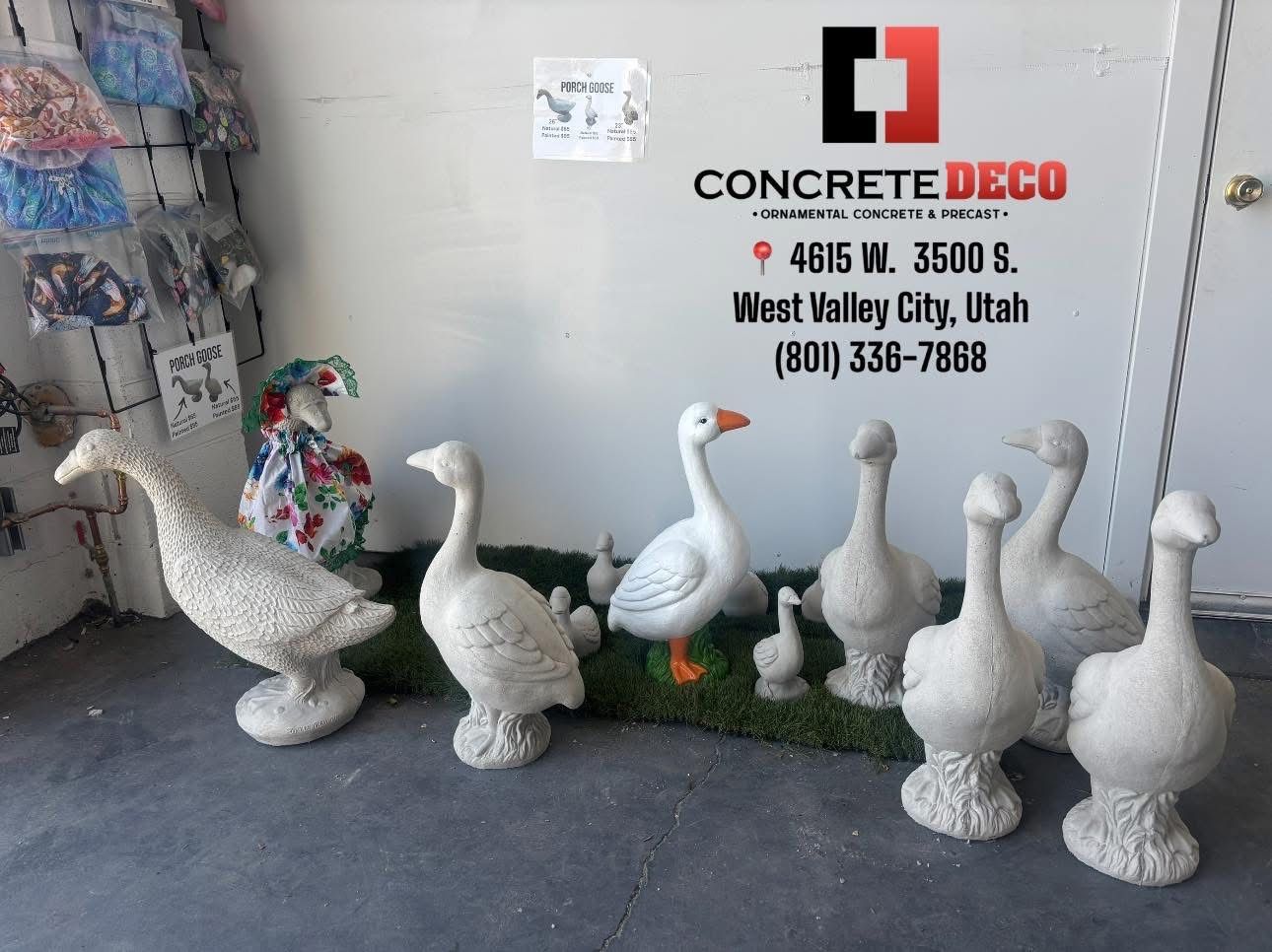 The concrete goose, also known as a porch goose or lawn goose, is a popular lawn ornament in the United States. Homeowners have lots of fun dressing them up for holidays & when they're favorite team wins.