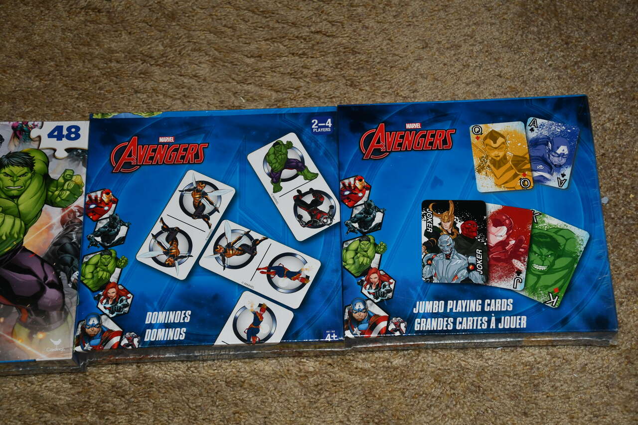 This NEW, SEALED Set of 3 AVENGERS Puzzle, Dominoes & Jumbo Playing Cards are from a smoke free home. The puzzle has 48 pieces. Questions??? Please ask. We are located in Plain City. Cash only please.