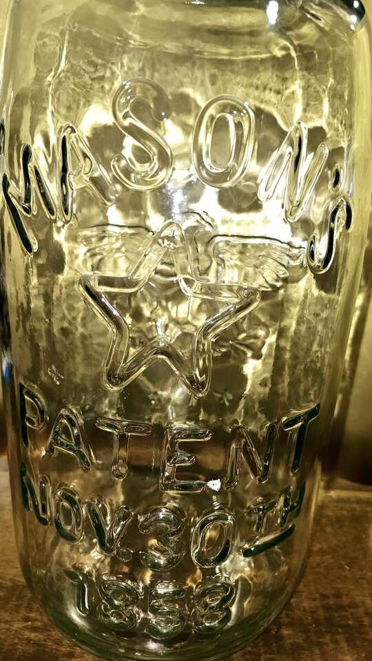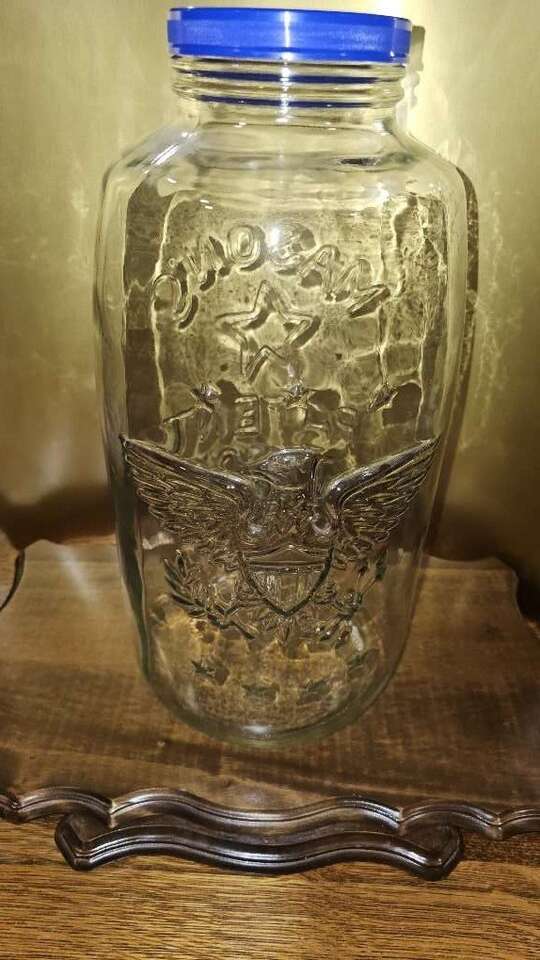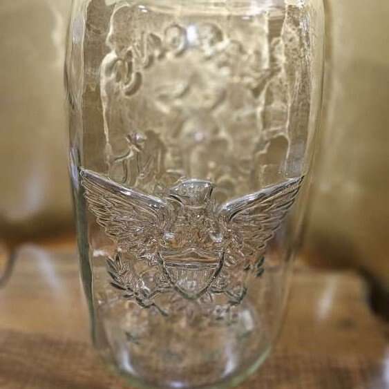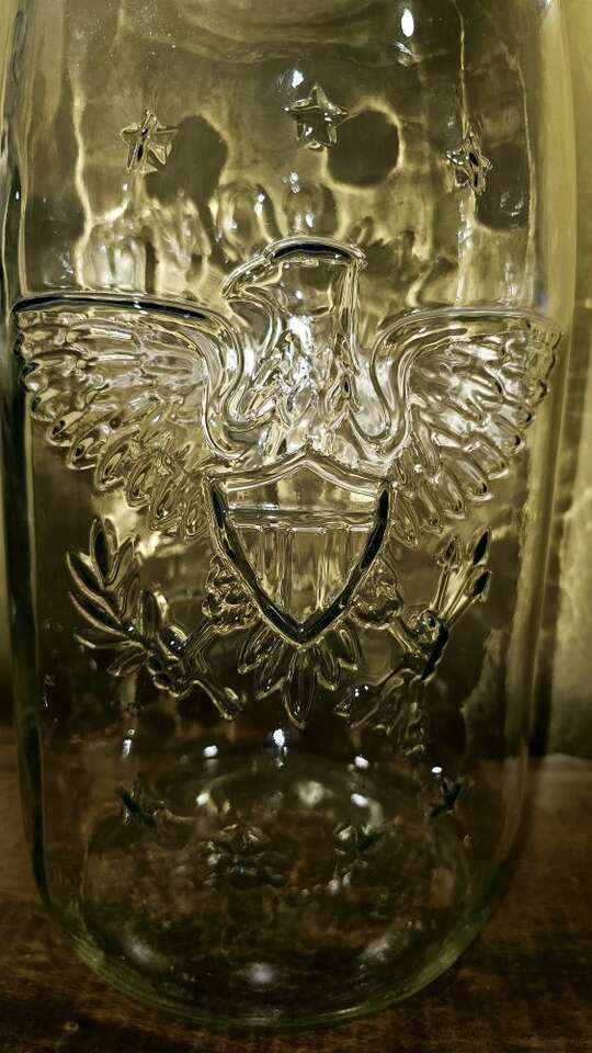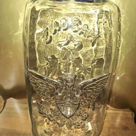5 Gallon 19" heavy glass Mason jar. Eagle with 7 small stars on one side and larger star on the other.