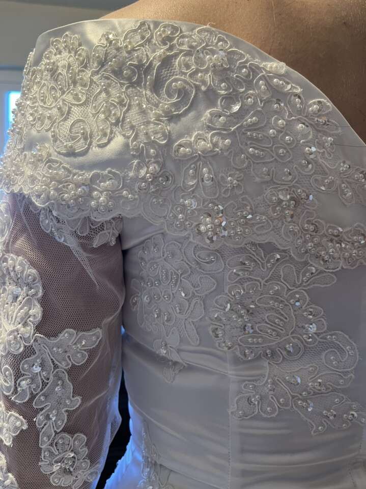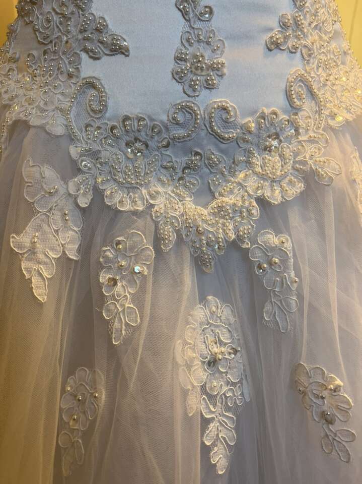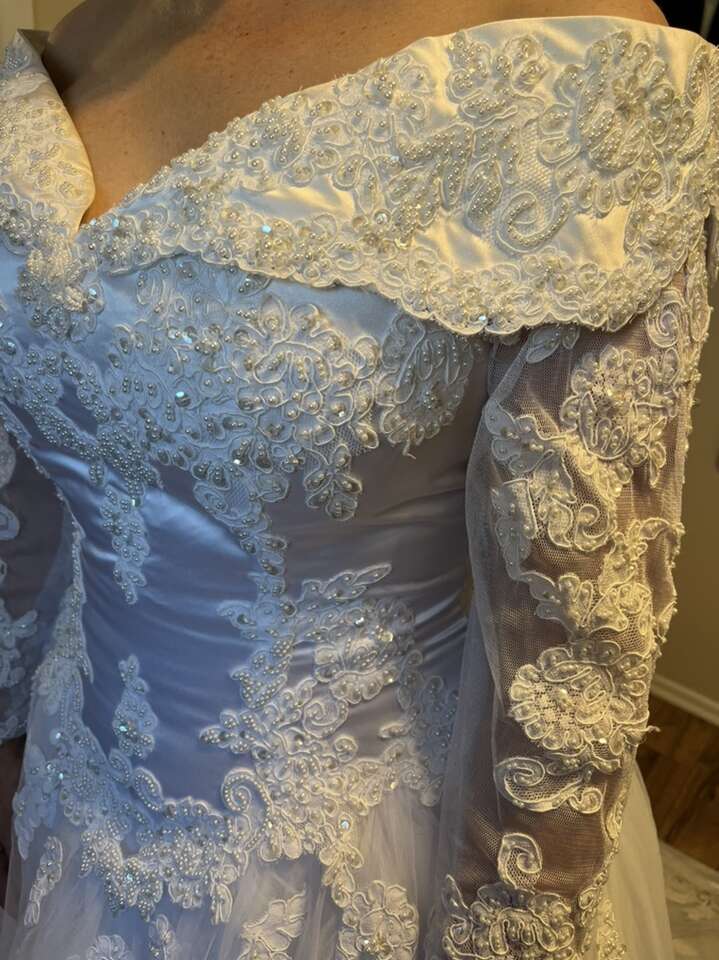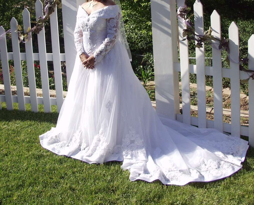 Authentic Gloria Vanderbilt wedding gown with chapel length train. Absolutely stunning with a timeless elegance like the design house that created it. The slightly off-shoulder style is reminiscent of the 1950s while the full ballerina style skirt adds that Cinderella / Princess effect of which we all dream. The photos show it with its own self-attached crinoline, so you don't need to buy an additional petticoat to achieve the look shown in this listing's photos. It is a very pale ivory but is definitely not bright white. The beading, pearls, and sequins in addition to the multiple layers of this gown make it quite weighty ... approximately 7 to 8 pounds. Retailed at approximately $1,000 so here's your chance to have a designer gown at a bargain price. Comes with a dress bag
