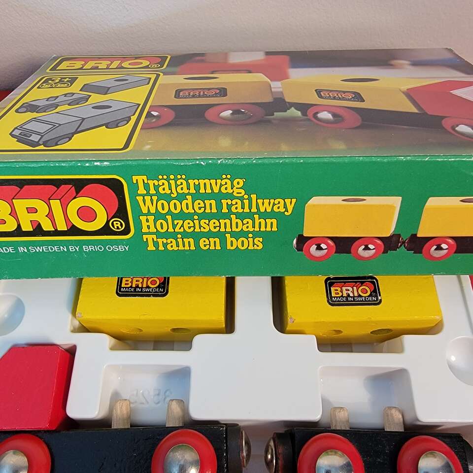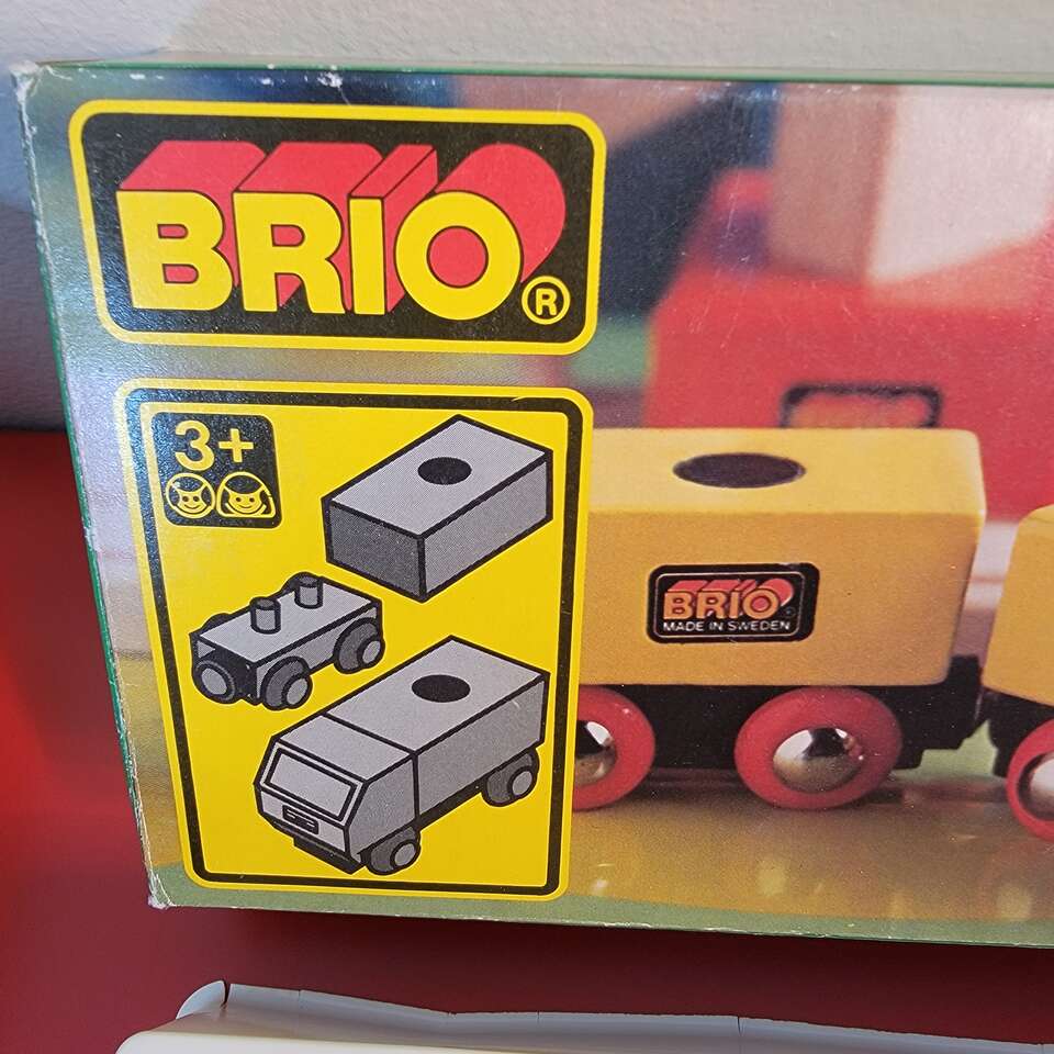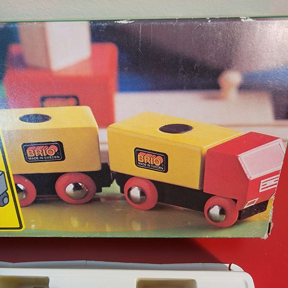 Vintage Red Balloon 1980's BRIO wooden railway 4 piece truck & trailer set with box. Yellow, black & red with magnetic coupling. Tops of cargo pieces have magnets so they can be lifted with a crane. Excellent condition. High quality, built to last for generations. Made in Sweden. Recommended for age 3+. Compatible with Thomas and other train sets. Please see seller’s other Brio & Thomas Train listings. Coming from a clean smoke free home. Cash & Venmo Accepted. Thank you for looking!