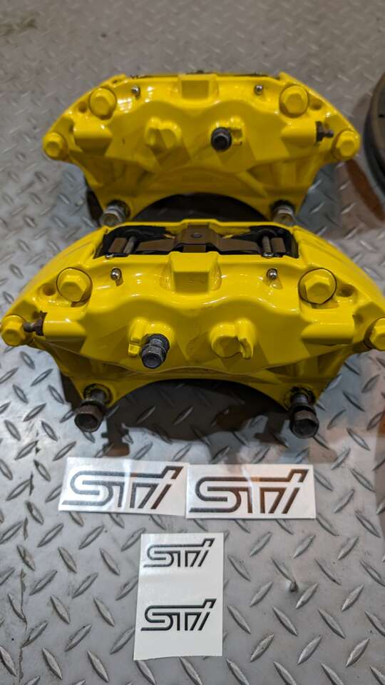 VenmoI am selling 2004 Subaru STI front rotors that have been powder coated hot yellow. The calipers also come with 5x100 rotors that I had custom orded to be slotted and dimpled (not drilled). The pads are Brembo street pads with lots of life left. I will also include high temp vinyl "STI" stickers to add to the calipers.