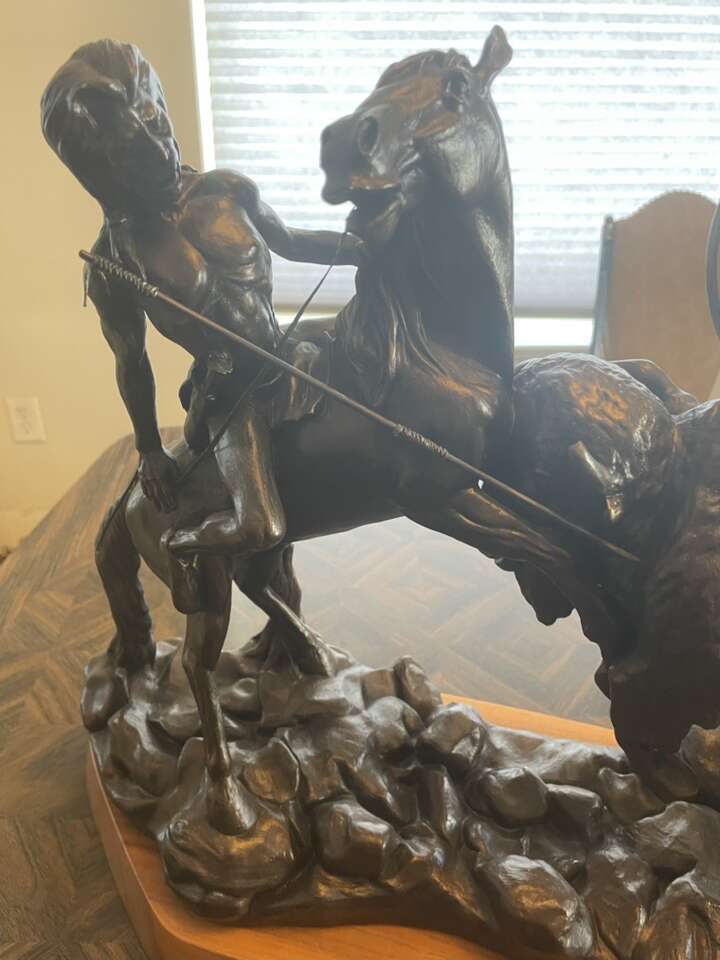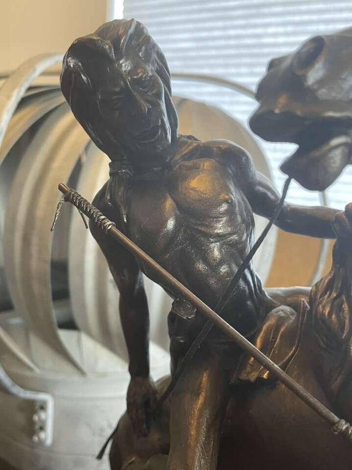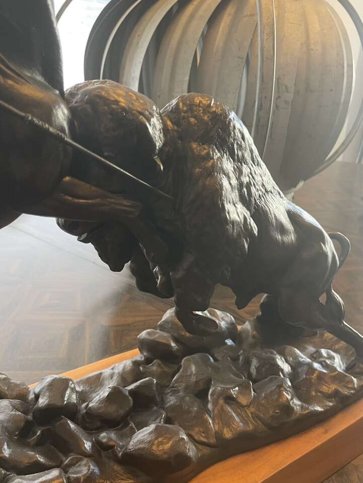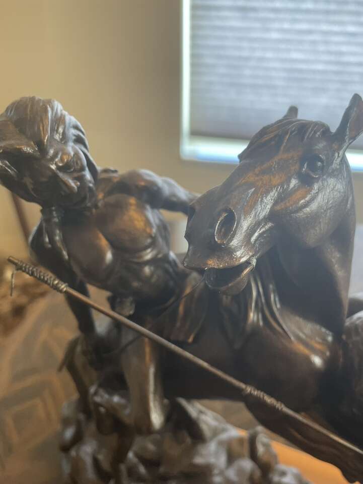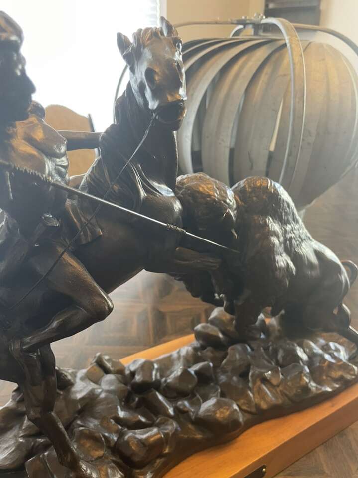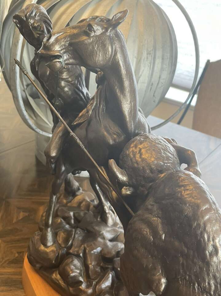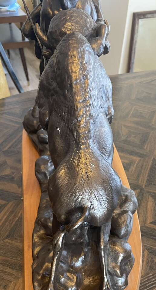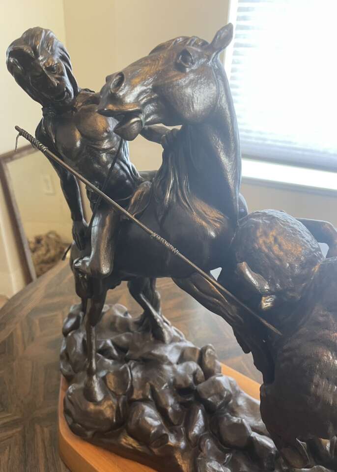 Amazing vintage bronze by D. Jorgensen . (The Victor) features a mounted Native American spearing a buffalo . Very fine intricate piece of artwork. Buffalo does have a chip on his horn but does not affect integrity of piece.