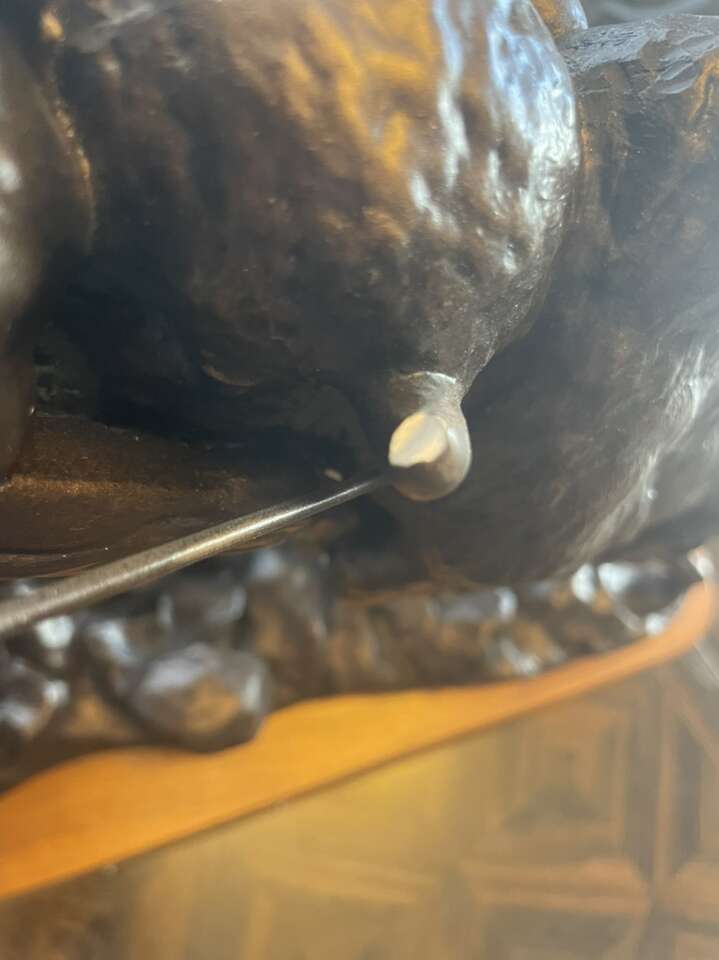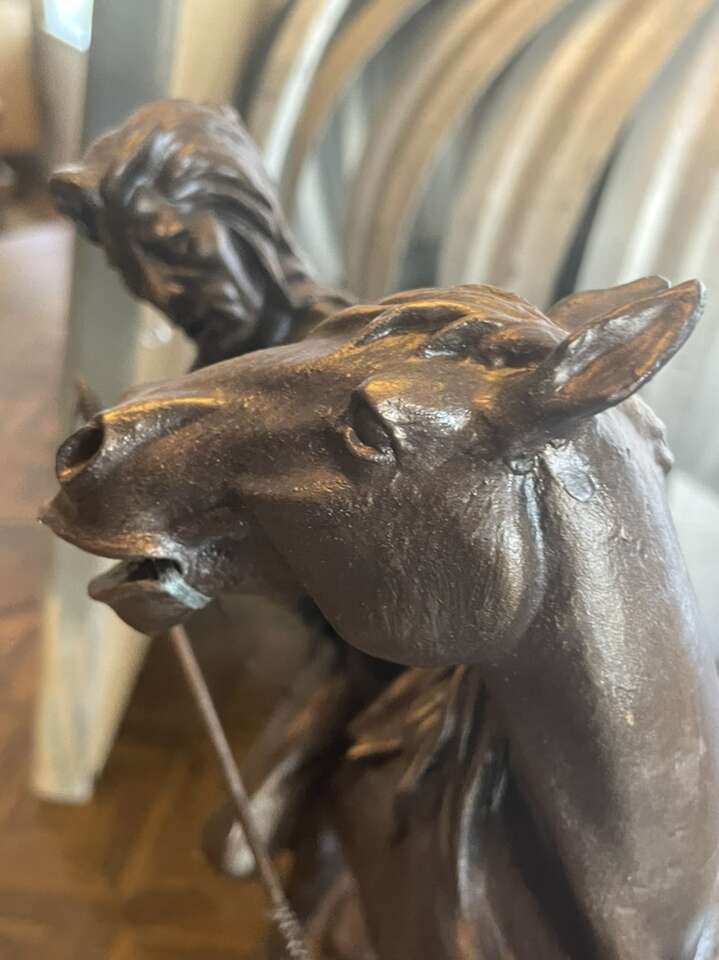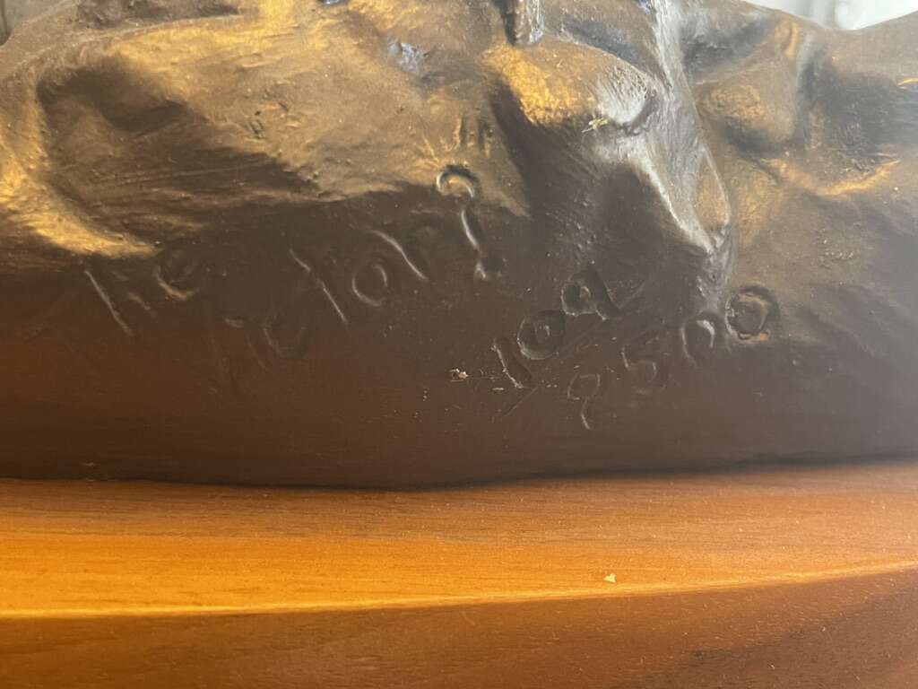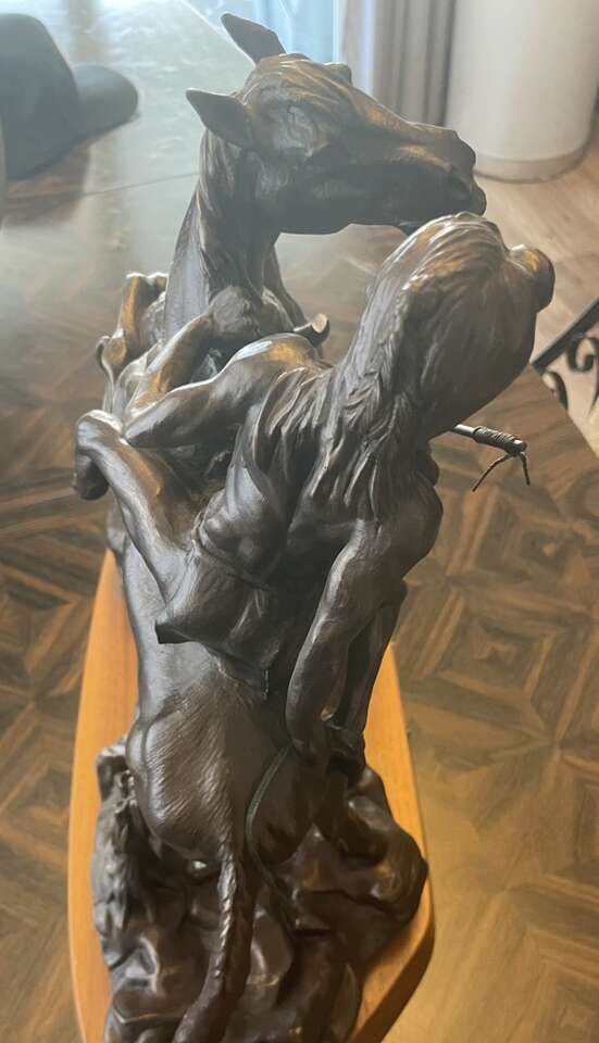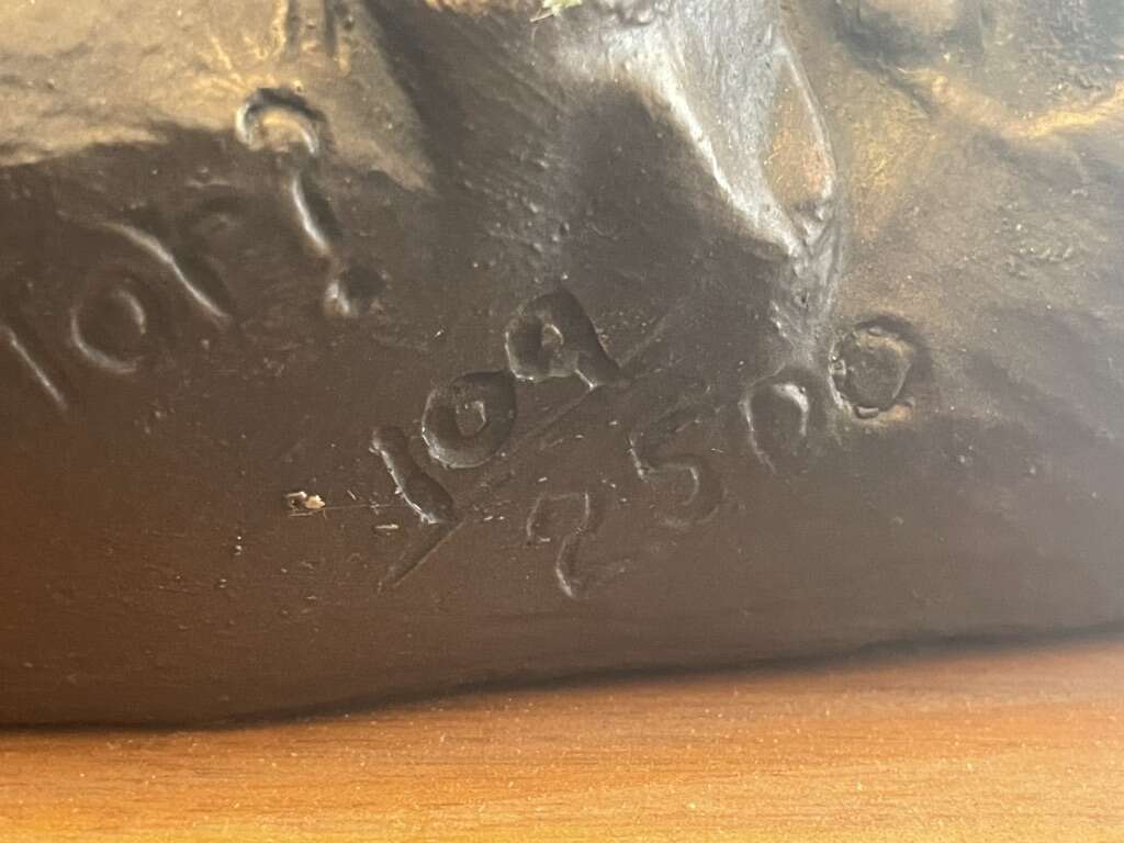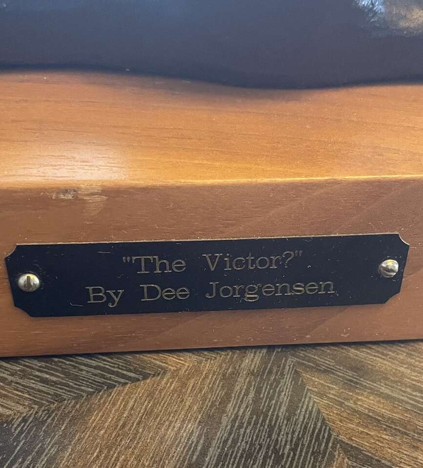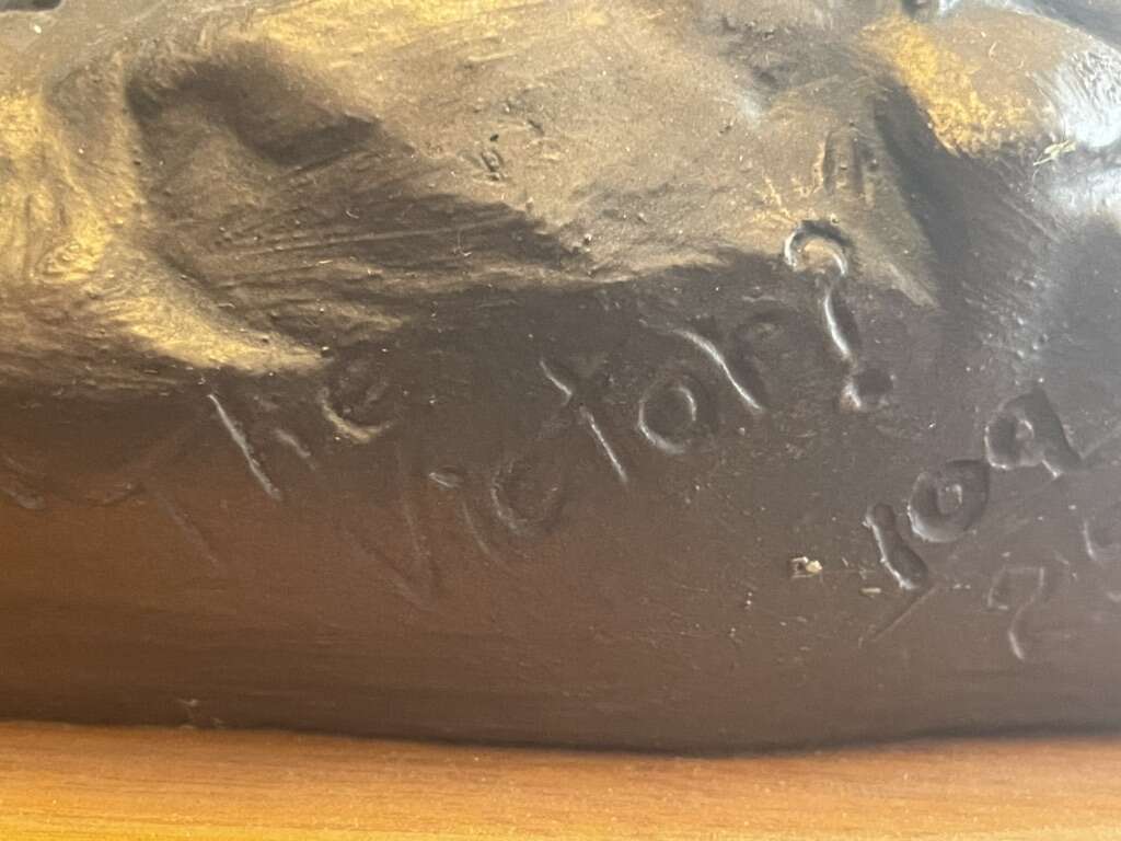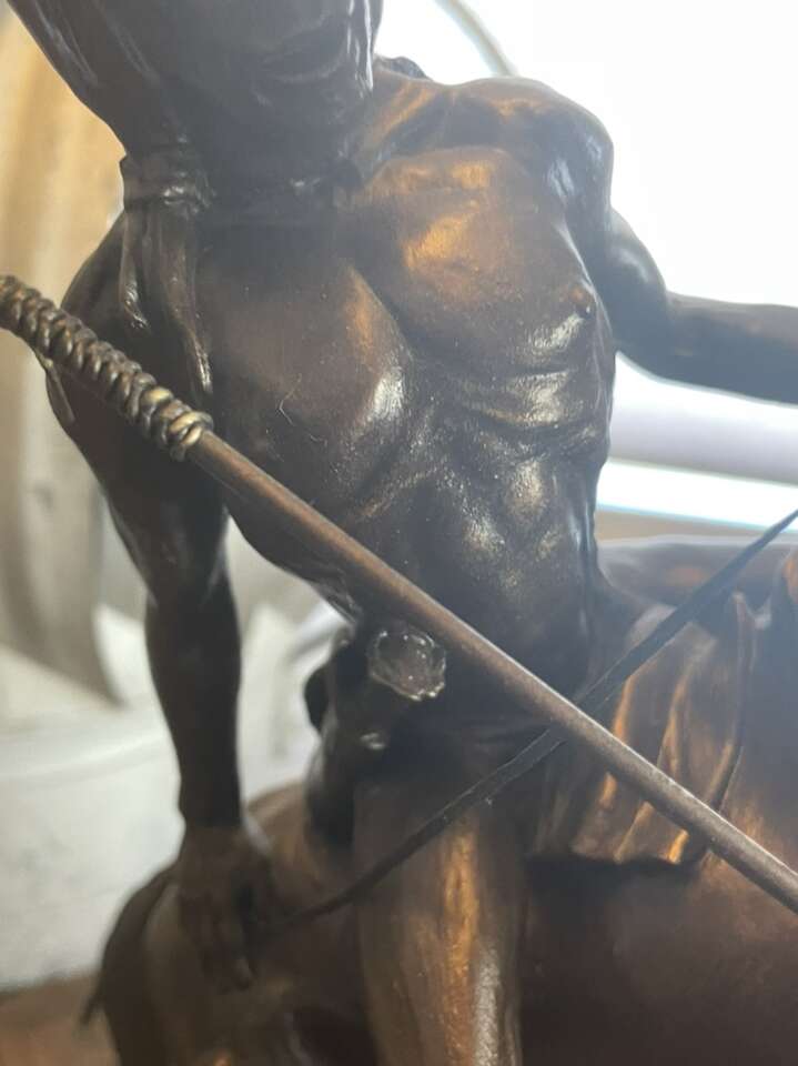 Amazing vintage bronze by D. Jorgensen . (The Victor) features a mounted Native American spearing a buffalo . Very fine intricate piece of artwork. Buffalo does have a chip on his horn but does not affect integrity of piece.