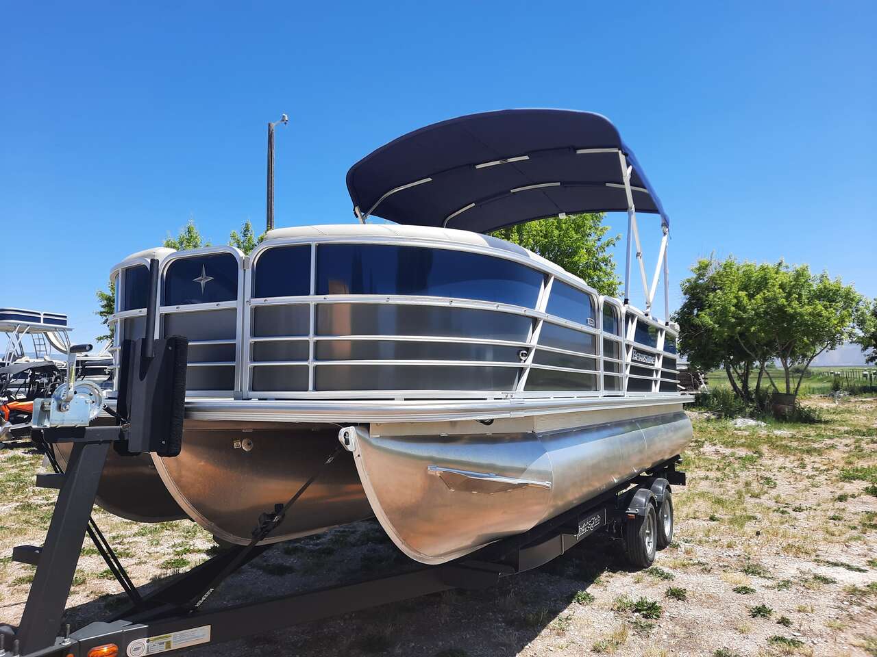 •11-person capacity • Powerful 150 hp Mercury outboard 4-stroke motor • Tow Bar for tubes • Roomy lounge seating • Bimini Shade • Tri-Toon for additional stability, lift and safety • Bluetooth Stereo System
