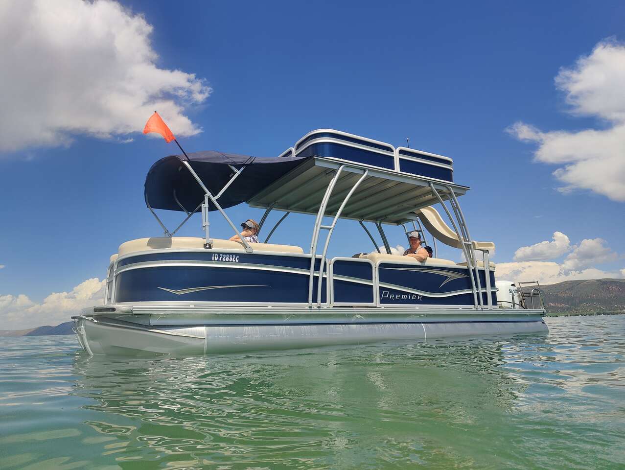 • 16-person seating capacity • Front Bimini shade cover plus shade from the upper deck • Bluetooth Stereo System • Top Floor with Water Slide • 250 hp Suzuki Outboard Motor • Tri-toon hull for added stability, lift and safety