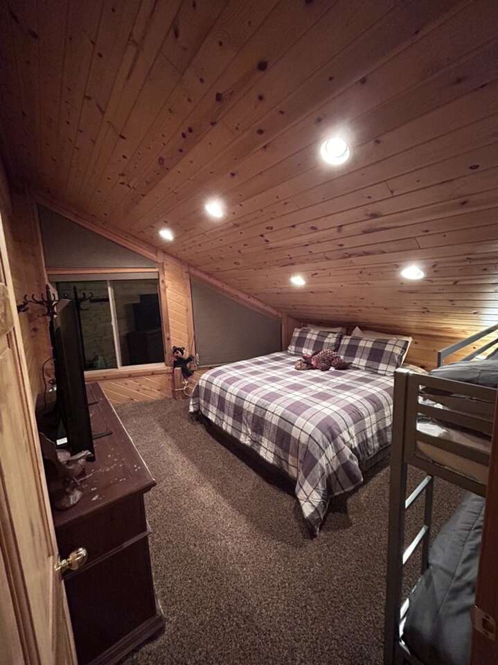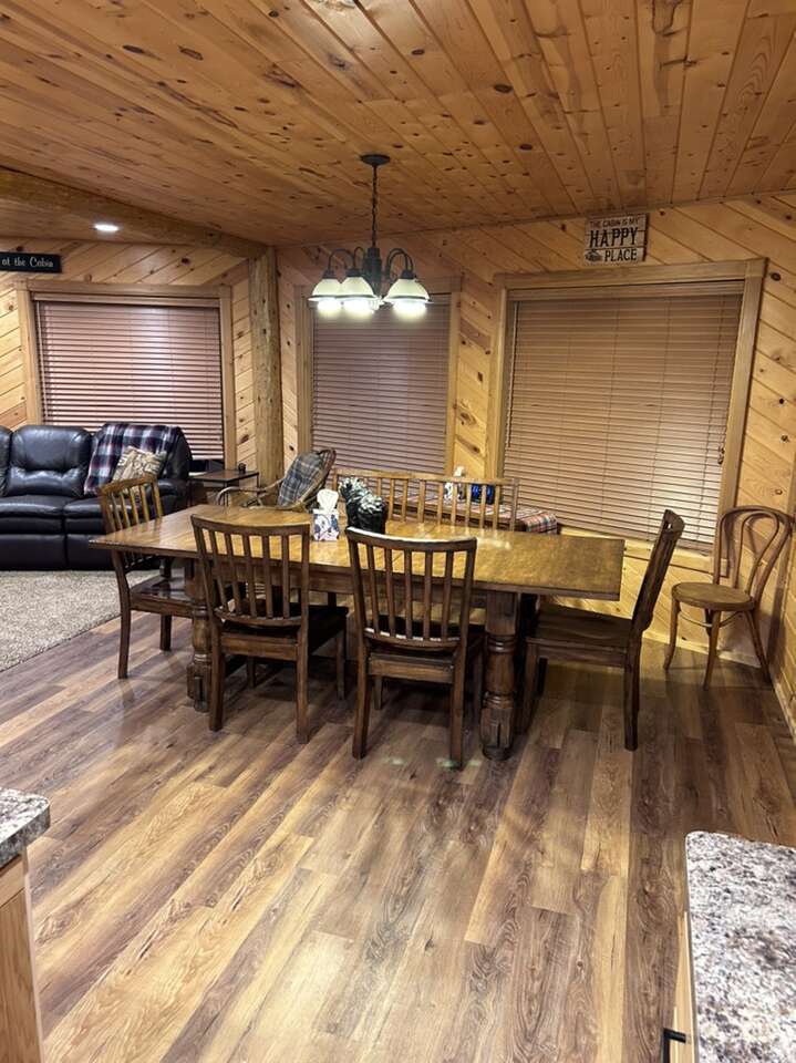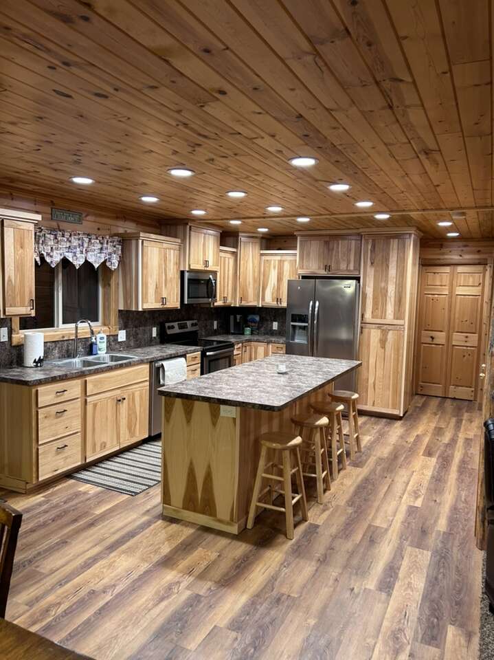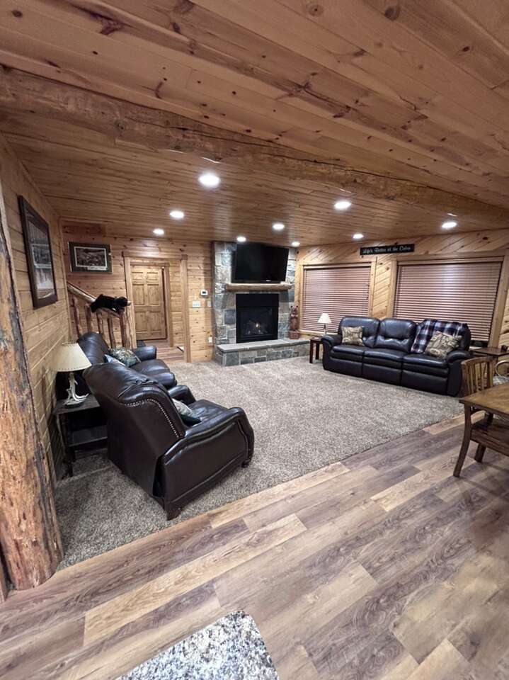New to the market. Very cozy. 5 bedroom 4 and half bath cabin. New kitchen. Large mudroom. Big front room. Large separate tv room. Hot tub. Covered deck and patio. Sleeps up to 14 in beds and has additional air mattress and pull out couch for more sleeping. Lots of space. Enjoy the 4 acres to yourself. Large driveway user friendly for trailers. Prime location for snowmobiling or atvs.
