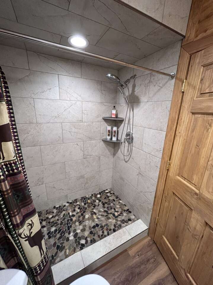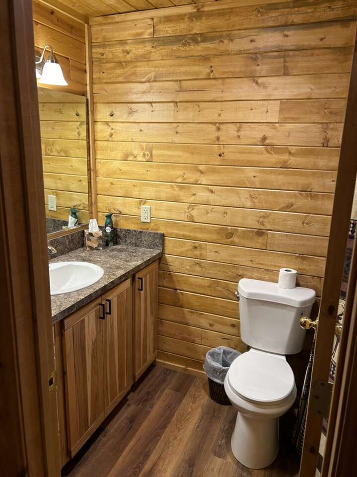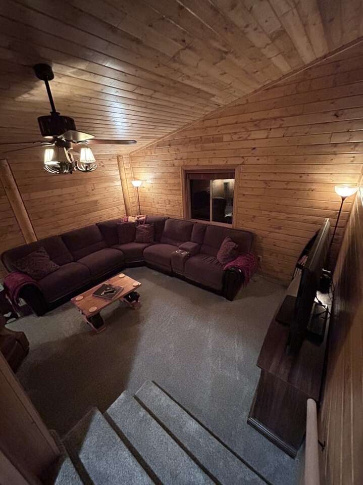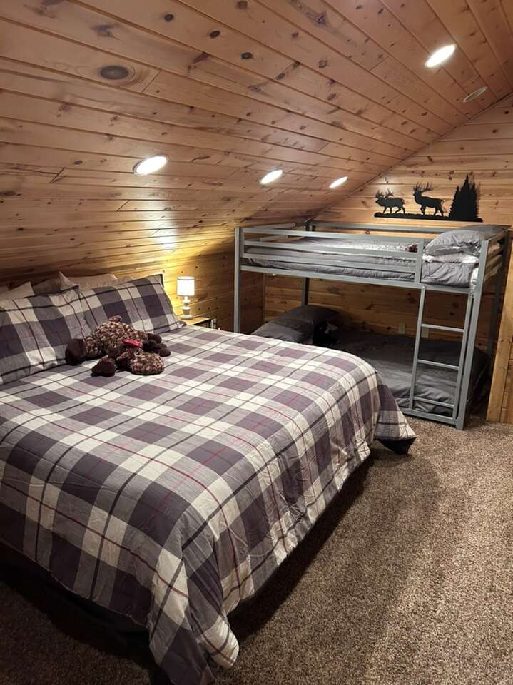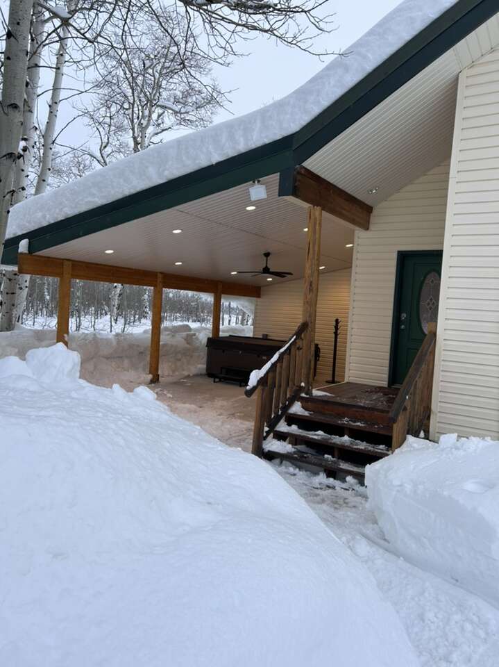 New to the market. Very cozy. 5 bedroom 4 and half bath cabin. New kitchen. Large mudroom. Big front room. Large separate tv room. Hot tub. Covered deck and patio. Sleeps up to 14 in beds and has additional air mattress and pull out couch for more sleeping. Lots of space. Enjoy the 4 acres to yourself. Large driveway user friendly for trailers. Prime location for snowmobiling or atvs.