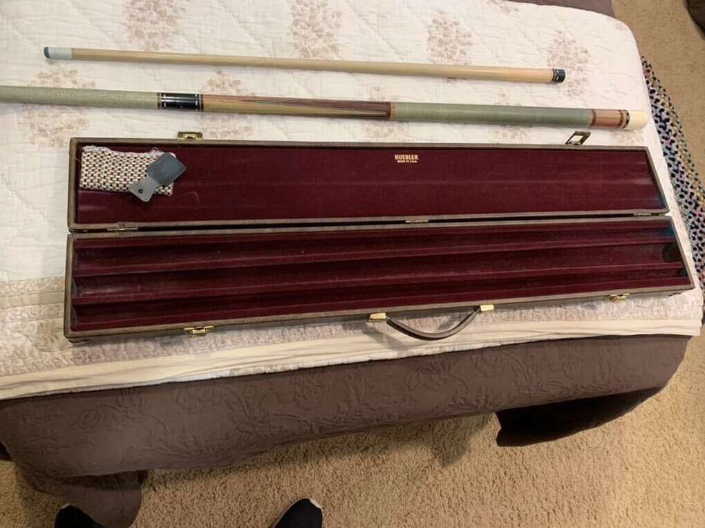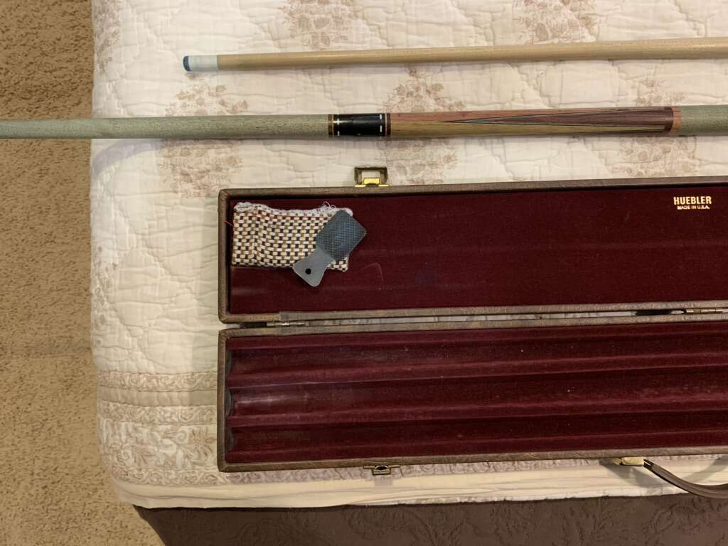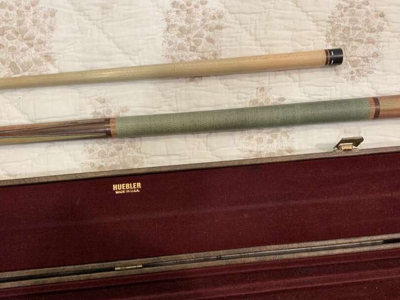 HUEBLER CUSTOM CUE. Regular eight ball shaft, plus snooker shaft. Original case. Soft joint.