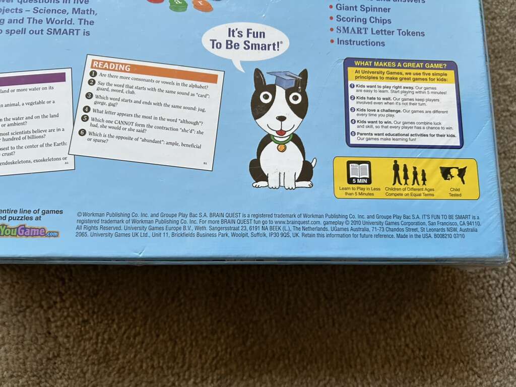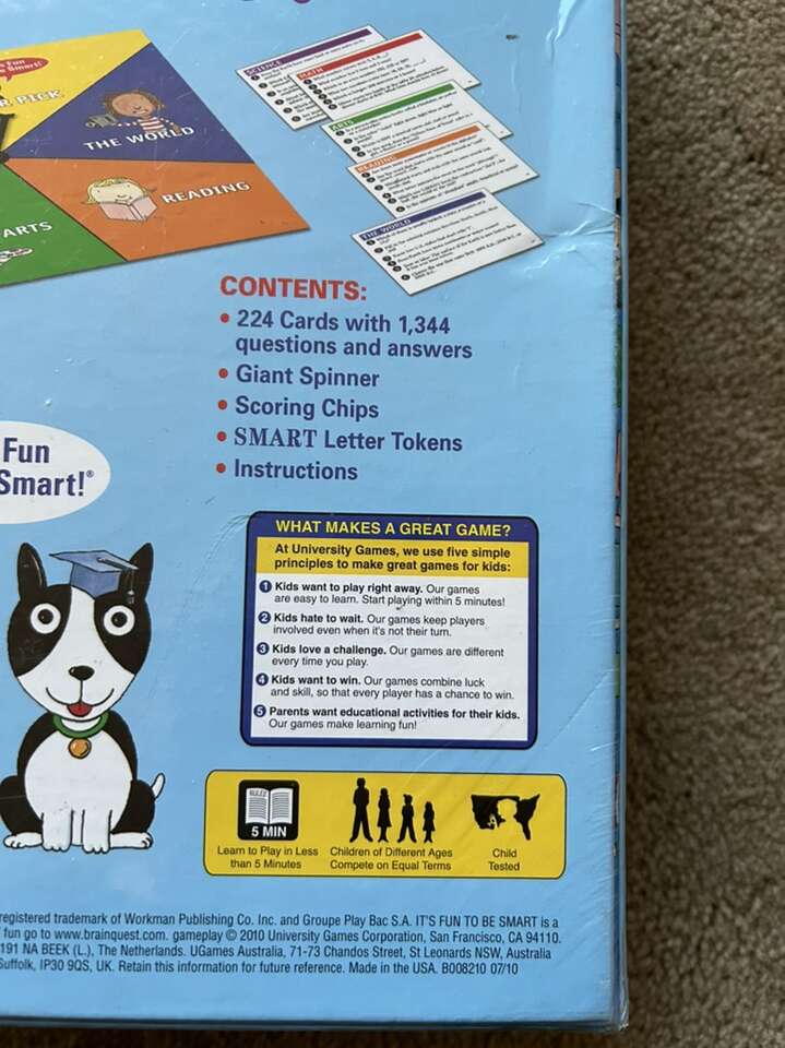 NEW (sealed in plastic) Brain Quest: Smart! Game. By University Games, 2010. Ages 6-12, 2-4 players. Adapted from Brain Quest, America’s #1 educational system. New, unopened condition. Text only. Cash or Venmo.